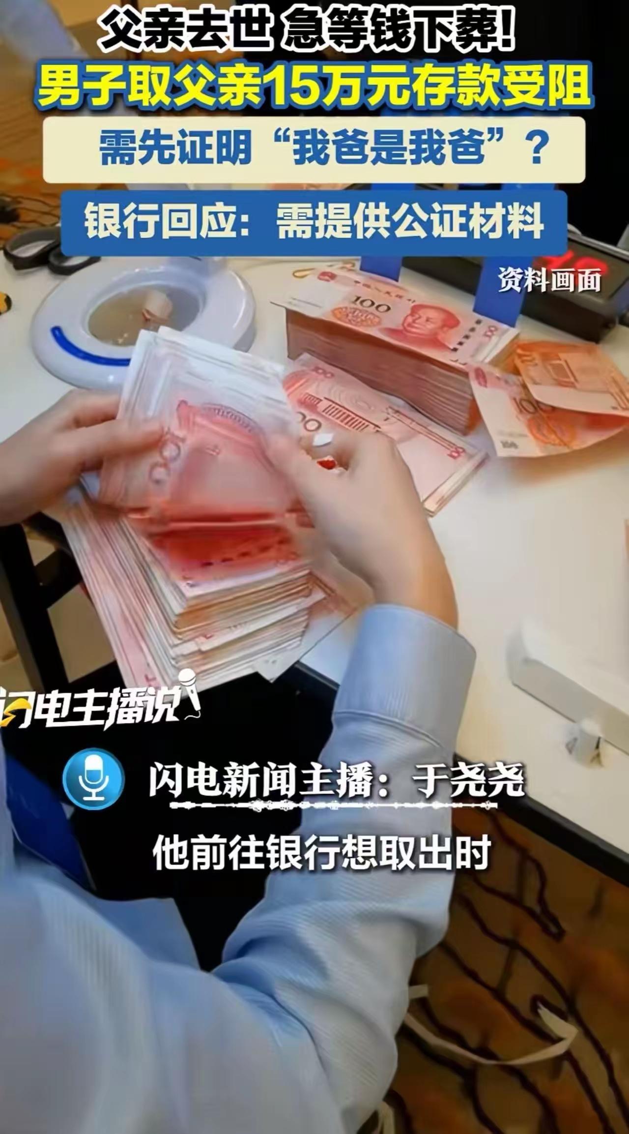 江西九江,父亲离世留下15万存款,儿子取钱却被要求证明“我爸是我爸”!儿子:这笔钱还等着用于父亲下葬。银行回应:并非故意刁难,取款总额超5万元,必须提供公证材料。 这事儿,谁看了不窝心?父亲辛辛苦苦攒下的15万,原本是留给家里最后的保障,结果等到儿子要用这笔钱给父亲办后事时,却被一道“证明我爸是我爸”的手续卡在银行门口。这不是电视剧里的离谱情节,而是真实发生在江西九江的故事。网友们炸了锅:难道亲生父子还要靠一纸公证来证明关系?这到底是制度的刚性,还是对人情的冷漠? 其实,银行的规定也有它的道理。超5万元的存款,确实需要严格审核,防止冒领、诈骗,这无可厚非。但问题是,现实往往比规定更复杂。父亲刚离世,儿子一边承受丧亲之痛,一边还得为繁琐的证明材料东奔西跑。公证处、派出所、银行三头跑,谁能体会那种心酸和无力?一句“并非故意刁难”,听起来理智,实际上却把无数家庭推向了“情感的死角”。 我们不禁要问:在保障安全的同时,制度就不能再有人情味一点吗?有没有可能,银行和相关部门能开通绿色通道,为这些特殊情况下的家庭提供更多便利?比如,结合户口本、死亡证明、甚至村委会的证明,能不能简化流程,让逝者家属不必在悲痛中再受二次打击? 透过这件事,我们看到了制度与人性的碰撞,也看到了普通人在现实面前的无奈。谁都不想钻制度的空子,但谁又愿意在至亲离世的时刻,被一纸证明绊住脚步?这种“证明我爸是我爸”的荒诞,其实正是对制度温度的拷问。 你怎么看?你遇到过类似的“奇葩证明”吗?如果你是银行工作人员,你会怎么处理?如果你是那位儿子,你会有怎样的心情?欢迎在评论区说说你的看法,也许你的一句话,就能推动这个社会变得更温暖一点。毕竟,制度的终极意义,是为了让我们的生活更有温度,而不是让亲情和责任在冰冷的流程中消磨殆尽。