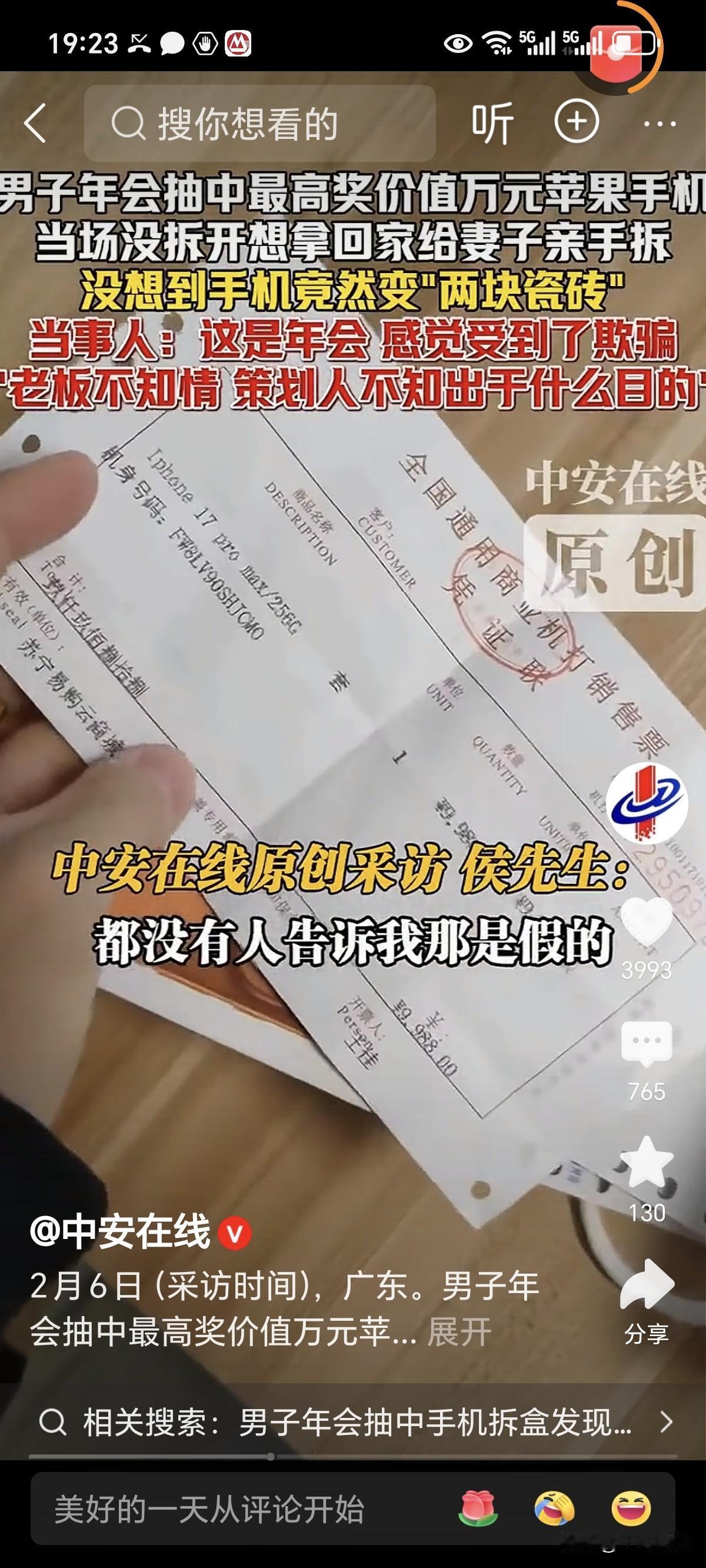 “太荒唐了!”广东,一男子参加公司年会,抽中一部9988元手机,老板郑重颁奖,男子兴冲冲拿回家里,想给妻子一个惊喜,谁知妻子打开,里面是两块瓷砖,可把男子给气坏了,这是欺骗!他回去一问,就连老板也不知情。 公司举办年会,员工们十分高兴,年会上热闹非凡,全公司的人聚在一起。 桌子上摆满了瓜子糖果,五彩的灯光闪烁不停,员工们自导自演,表演着各自拿手的节目。 而最让大家期待的,莫过于那激动人心的抽奖时刻,抽奖箱像一个宝 盒,里面装的是期待和梦想。 员工们纷纷上前,轮流在箱子里拿出奖票。 陈先生也不例外,他眼睛紧紧盯着抽奖的箱子,他拿出自己那张,默默在心里祈祷:“让我中个大奖吧,我想给老婆一个惊喜!” 终于,奖项揭晓,主持人在舞台上大声播报着中奖人员名字,被喊到的员工满脸高兴,咚咚咚跑到台上,领取属于自己的奖品。 陈先生手心紧张,心里默默的念叨着希望,主持人提高了音量,大声喊道:“陈先生,获得特等奖手机一部!” 陈先生满脸激动,差点从椅子上跳了起来,同事们欢呼鼓掌,为他打劲,推着他赶紧上去领奖! 他快步上前,同事们投来羡慕的眼光,公司领导拿着手机,郑重其事的给他颁奖。 这部手机,价值9988元,正是陈先生心仪已久的最新款手机。 他激动万分,双腿颤抖,这是个喜讯,他不能独享,他要拿回家里,给妻子个惊喜! 主持人满脸笑容,对陈先生说着恭喜恭喜,领导给他颁奖握手,肯定他一年为公司做出的成绩。 陈先生高举手机,向同事领导感谢,感谢大家的鼓励,他明年还会再接再厉! 直到年会结束,没有人再给他说过什么,同事们依依惜别,互相说着鼓励的话语。 陈先生回到了家里,从包里拿出那部万元的手机,妻子脸上洋溢着幸福,她不是稀罕这部手机,她稀罕的是丈夫的情谊。 妻子接过盒子,她轻轻打开,想看到盒子里满满的惊喜,可万万没有想到,当她看到盒子里的东西,笑容凝住,一脸的惊讶和疑惑? 老公,手机在哪?这里面装的不是手机! 陈先生往盒子里看,他顿时傻眼,盒子里哪有什么苹果手机,竟然是两块硬邦邦的瓷砖! 陈先生怒火冲天,员工怀着这么大的希望,每个人抽奖,都小心翼翼,希望新的一年,能有好运! 如今手机变成了瓷砖,这是在干嘛?欺骗员工? 第二天来到公司,陈先生拿出那两块瓷砖,他这时才发现,别的员工毫不知情。 就连颁奖的领导也不知道,手机盒子里是两块瓷砖? 陈先生不愿意了,这是年会啊,一年就这么一次,员工们辛辛苦苦,就盼着年会能拿到一些福利! 抽奖得到手机,全凭自己的运气,员工抱着那么大的希望,怎么能开这种玩笑? 更何况已经连累到了家属,就连妻子也气愤不已!难道一年的付出,都换不来一部真正的手机? 到了最后,陈先生才搞明白,原来是年会节目的策划做的这个事情! 陈先生感到受到了极大的欺骗,他要求策划道歉,他不明白策划是什么目的。 也许是为了活跃气氛,也许只是开个玩笑,但是此时此刻,这些都不重要。 公司的年会,是为了总结和肯定一年的工作,总结之余,也是让员工感受到公司的关怀,公司和员工团结一致,为明年的发展更进一层。 这么严肃的事情,又是如此的郑重,任何人都没有想到,手机是两块沉甸甸的瓷砖。 陈先生认为,这不是普通的玩笑,这是欺骗,他和策划进行了协商,策划告诉他说,在10号时候,还会举办一个大型的年会。 到时候策划会当着所有人的面,给陈先生鞠躬道歉,陈先生表示,我就想要一个道歉,关于手机赔偿,他并没有强烈的要求。 有网友立刻回应: 懂了,以后得奖一定当面拆开,高举过头顶,一来表达喜悦,二开避免领到瓷砖。 也有人说,看到开箱视频里有发票什么的,公司肯定掏钱是买了这个手机作为礼物,就是不知道活动策划人员什么意思。 更有人说,这事肯定是要道歉,也需要赔手机,本来就是中奖被偷换了。 公司年会,本应是很严肃的事,这样搞有点过分,这下好了,全网都看见了。 玩不起别玩,年会上这样,的确是太过分了,对待自己的员工,都没诚信。 你可以说是玩笑,也可以说是活跃气氛,可是你让员工们咋看待公司,没有诚信,以后的工作哪来的动力? 再说年会,又不是就这一次,你这次这样,下次又会咋样?员工还要不要参与?领导还要不要颁奖?颁奖那一刻还要不要郑重其事,你让员工咋相信公司? 希望能有个完美的结果,若是有人故意调包,这价值也够得上刑事案件立案了。 对此,你怎么看?
