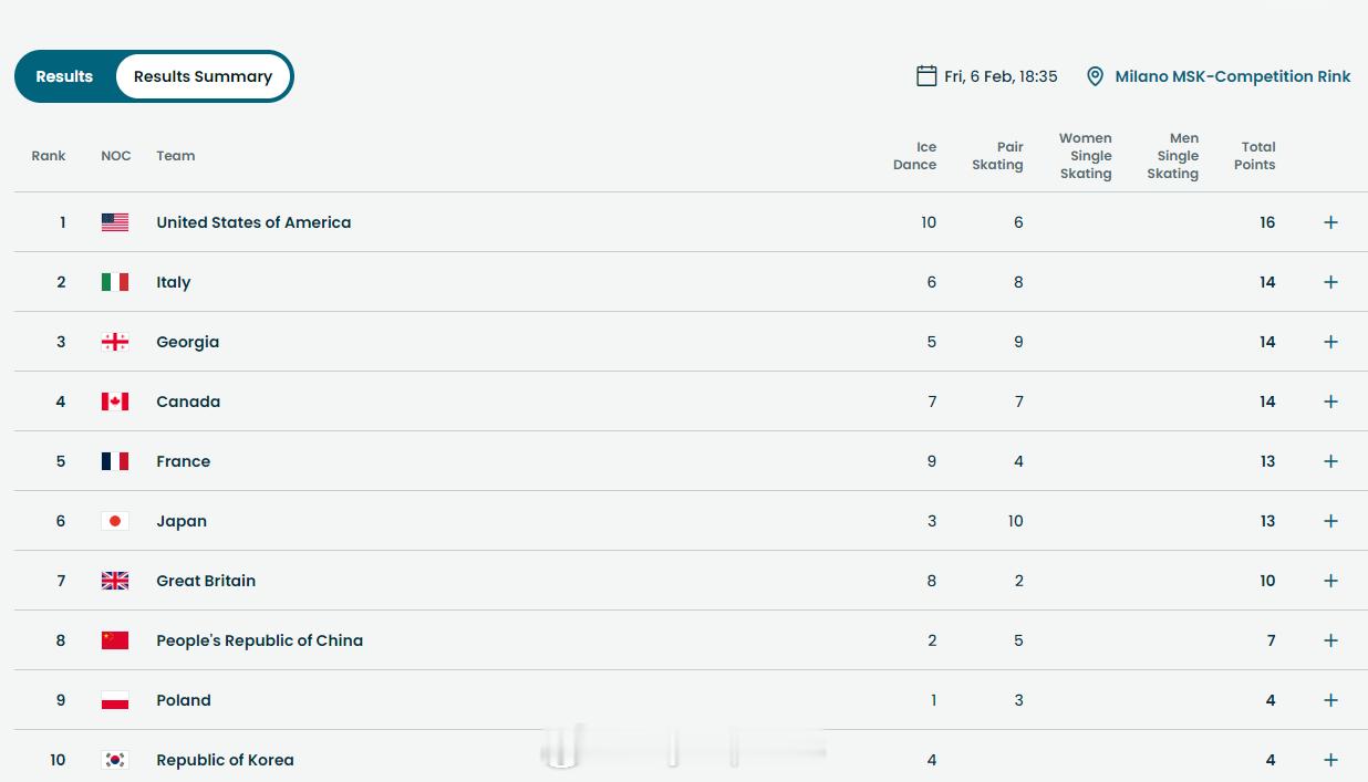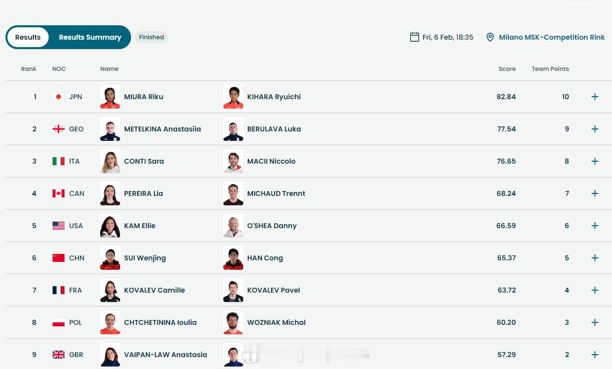 【冬奥花滑团体赛资格赛中国暂列第八】冬奥会米兰冬奥会 2月5日,冬奥会花样滑冰团体赛资格赛结束冰舞韵律舞和双人滑短节目两项。王诗玥/柳鑫宇韵律舞排名第九,隋文静/韩聪在短节目中出现大的失误获得第六。两项下来,中国队以7分在10支队伍中暂列第八。美国、意大利和格鲁吉亚占据前三。隋文静摔倒