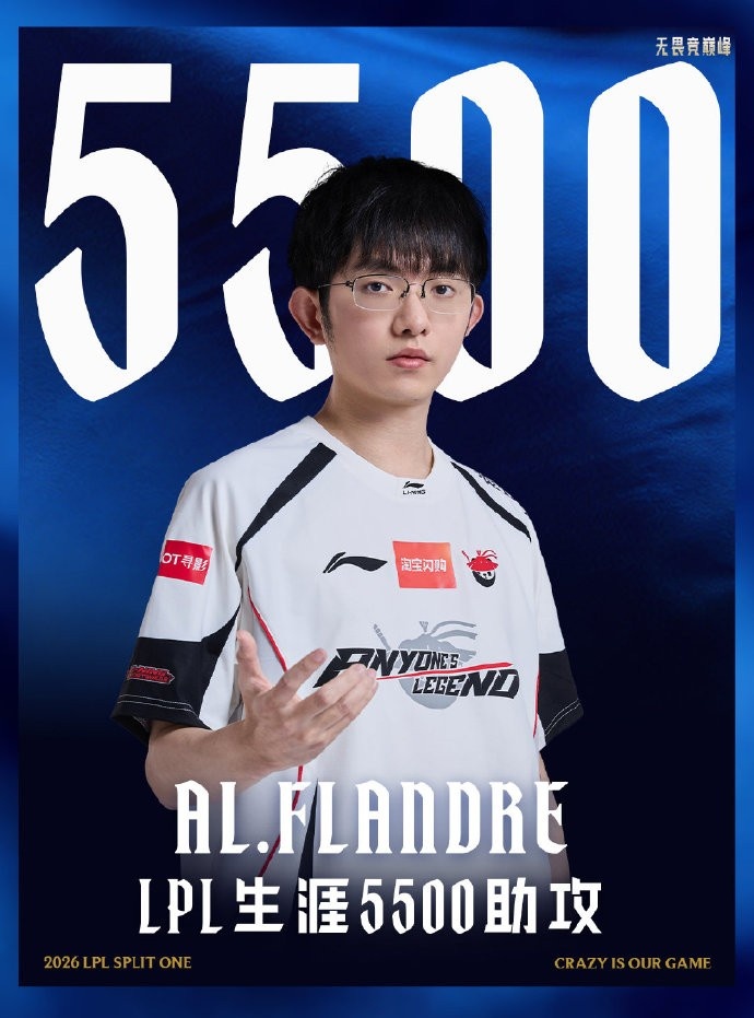 直播吧2月6日讯在今日AL对战BLG的比赛中,Flandre使用雷克顿达成了在LPL的第5500次助攻,是第9位达成该成就的选手,恭喜Flandre!