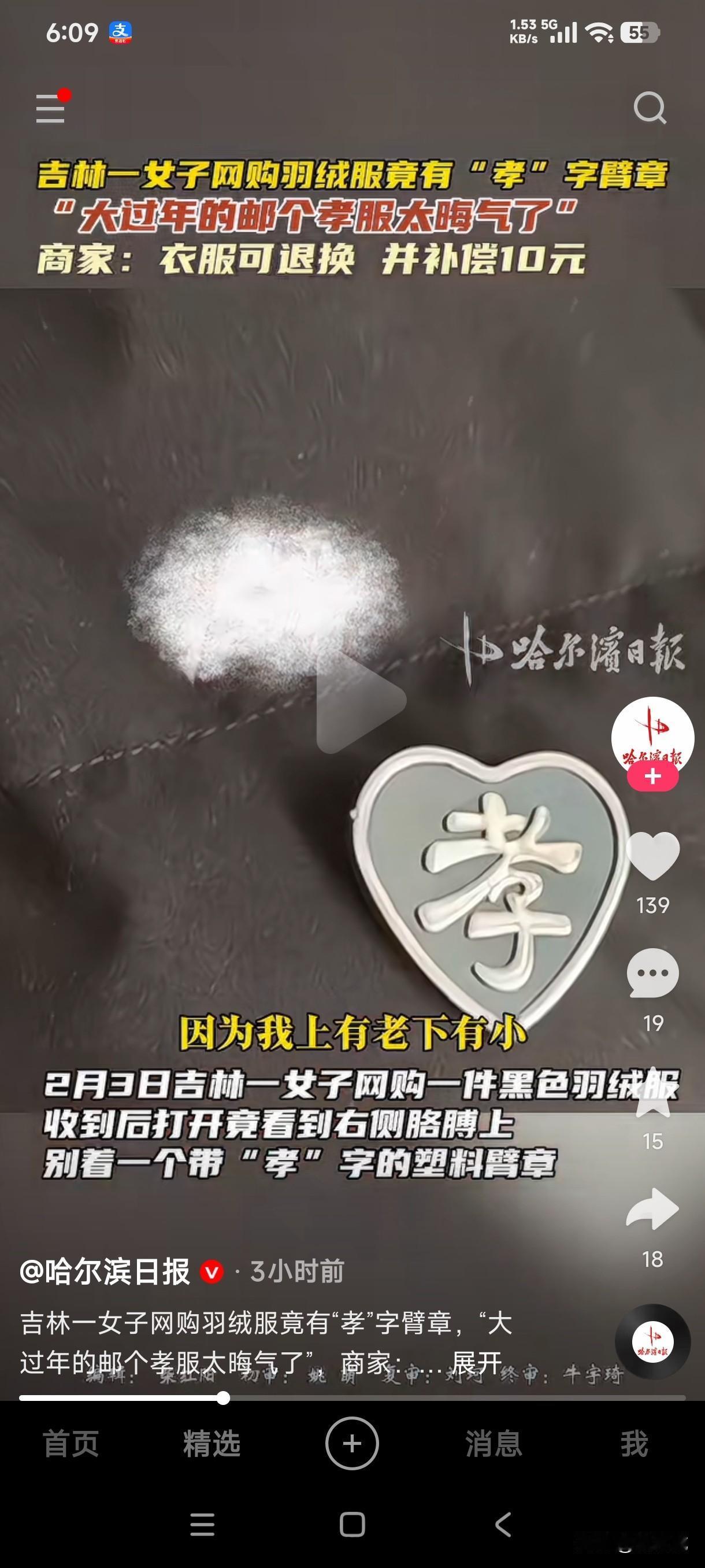 吉林一女子网购黑色羽绒服收到货后打开一看,右侧衣服袖子上居然别着一个带孝字的塑料臂章,大过年的这是买了个孝服吗? 这事搁在谁身上都觉得晦气不舒服,花钱买羽绒服居然收到的是孝服?这上有老下有小的这不是膈应人吗?不知道这女子买到的衣服是别人买去穿过之后退货的?还是这衣服是从二手市场收到的?商家在发货的时候也没有仔细检查就那样糊里糊涂的发走了,商家的意思是衣服可以退换,并且给女子补偿10元,这是钱的事吗,补偿10元到底能干啥,就算是把这件衣服退了重新发一件,这心里的阴影一时半会能消除吗?真是癞蛤蟆爬脚面不咬人膈应人!