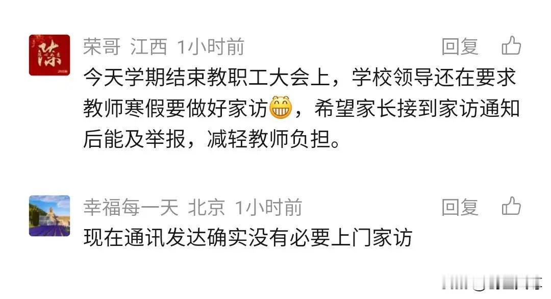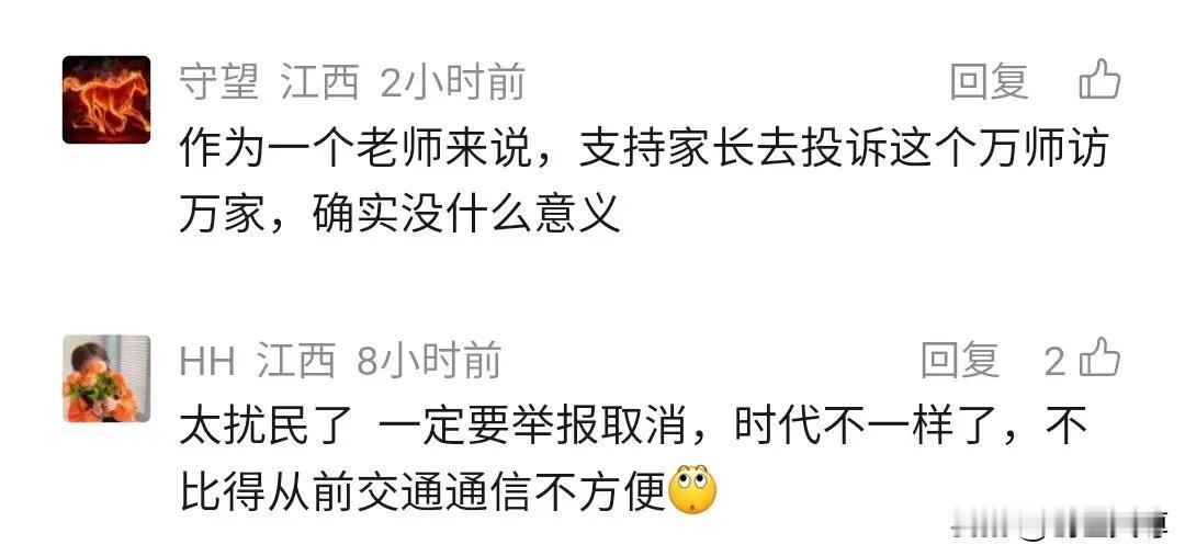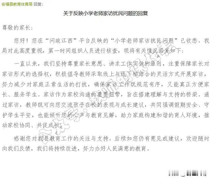 江西一家长问政平台投诉:万师访万家,除了扰民意义何在? 家长的心声我们听到了,也许你会觉得困惑:老师频繁的家访,真的有必要吗?尤其是在孩子们已经在学校接受了那么多关于安全的教育之后,为什么还要反复“叮嘱”我们这些家长?这背后,似乎隐藏着一些我们未曾察觉的深意,也折射出一些教育与家庭沟通的盲点。 其实,这些看似“无效”的家访,背后有一层更深的意义。老师们或许并不是单纯为了“讲安全”而来,而是在试图用一种温暖而细腻的方式,拉近师生、家校之间的距离。毕竟,孩子的安全不仅仅是学校的责任,更是家庭的责任。老师的“上门”提醒,也许是一种关心的体现,是在用行动告诉家长:我们都在为孩子的成长保驾护航。 然而,问题也确实存在。频繁的家访,容易让家长产生反感,甚至觉得被打扰、被打扰了家庭的平静。这种“重复”的过程,是否真的能带来实质性的帮助?还是说,学校和家庭之间的沟通方式还可以有更智慧、更高效的创新?我们不妨换个角度想:在信息如此发达的今天,是否可以用更便捷、更富有成效的方式,替代那些繁琐的“走访”?比如,利用微信、电话、视频会议等现代化手段,既节省时间,又能精准传达安全知识。 更重要的是,这反映出一个社会性的问题:我们对“安全”的理解是否过于单一?学校强调安全,家长也每天叮嘱孩子,可为什么还是会出现安全事故?这说明,安全教育不能只停留在“讲”上,更要落到“做”上。家庭、学校、社会三方的合作,才是真正筑起孩子安全的坚固防线。 从家长的角度看,我们希望的是一种尊重彼此时间和空间的方式。你可以想象,如果老师能在开学初就明确家访的频次和目的,家长们就能提前做好准备,不会感到突如其来的“突袭”。如果学校能够借助科技手段,建立一个安全信息平台,把重要的安全提示、家庭作业、沟通事项都集中在一个平台上,岂不是更高效也更贴心? 其实,孩子的安全,归根结底还是我们每一个家庭的责任。老师的家访,是一种“提示”和“陪伴”,但更需要我们共同用心去营造一个安全、温暖的成长环境。只有打破“形式主义”的尴尬,建立真正高效、温馨的沟通,才能让“安全”不再是空洞的口号,而是真正落到实处的行动。 最后,亲爱的家长朋友们,你是否也曾在烦恼中思考:我们需要的,是那种“走马观花”的家访,还是一种真正贴心、实用的交流?也许,下一次当老师打电话说要家访时,不妨用一种温暖的心态去迎接,理解背后的用心,也期待未来,我们能用更智慧、更高效的方式,共同守护孩子的每一步成长。