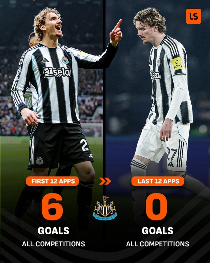 但与加盟之初形成对比的是,近12场各项赛事,沃尔特马德颗粒无收,他上一次为纽卡进球还是在去年12月底,而他近12场球荒期间,纽卡战绩仅为4胜3平5负。