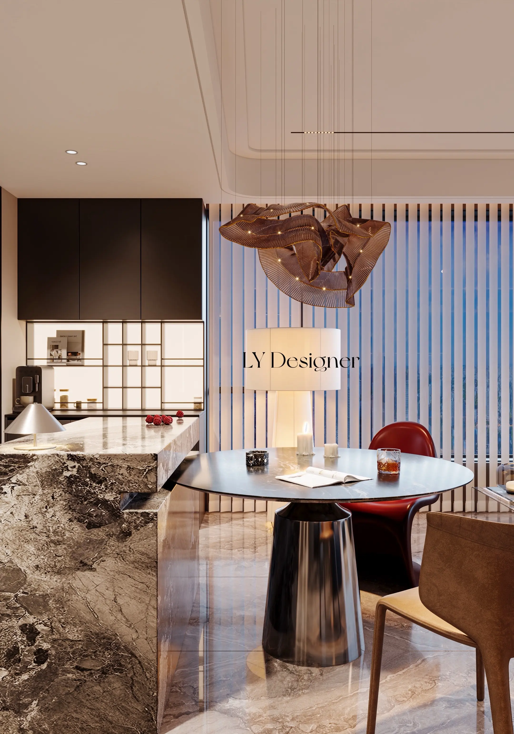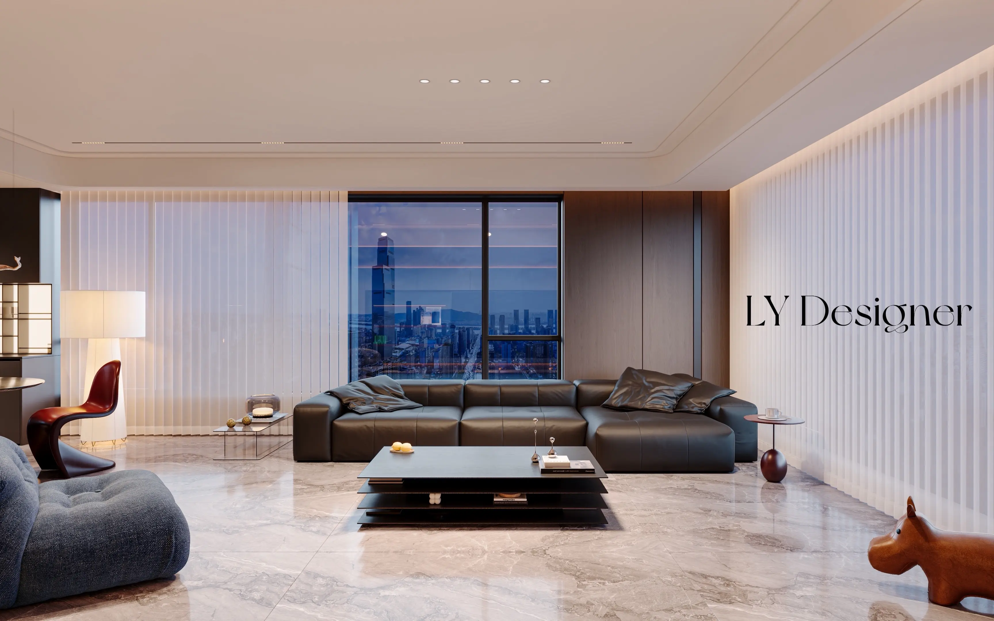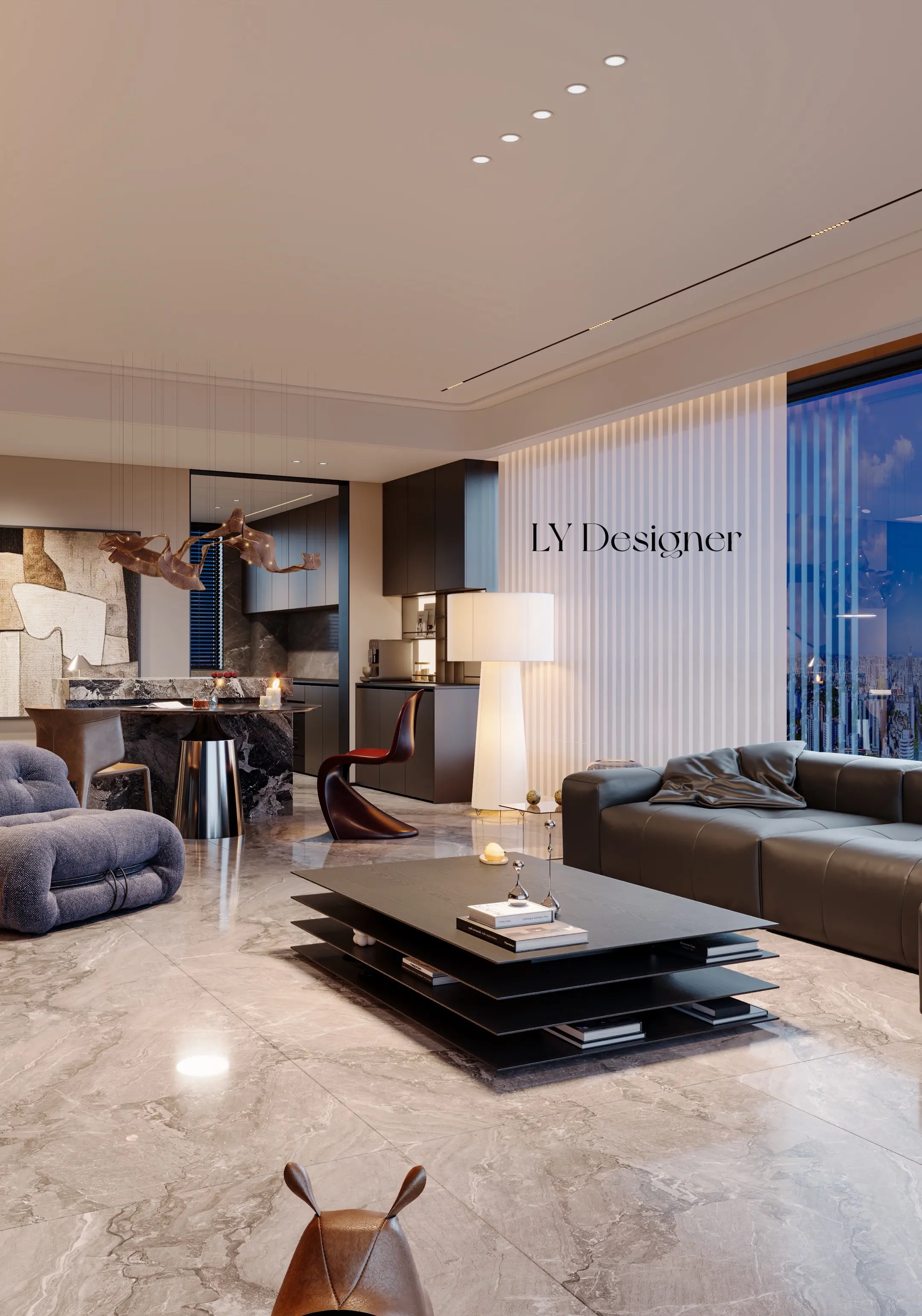 • 𝑳𝒀 𝑫𝑬𝑺𝑰𝑮𝑵 140平 精装房改造设计 整体风格与氛围 🌬️风格定位:意式轻奢风,强调线条感、材质质感与光影运用。 💡氛围营造、通过无主灯设计、隐藏灯带、落地窗引入城市夜景,营造出"高级感+静谧感"的居住体验,尤其适合傍晚或夜晚的沉浸式生活场景。 空间布局与功能 🏠开放式布局:客厅与厨房/餐厅区域无缝衔接,视觉通透,空间感拉满。 🛋️核心家具: 🏿深色皮质沙发+多层黑色悬浮茶几,简约而有层次。 🛋️灰色毛绒单人沙发,增加舒适度与温度。 🍴餐厅区域采用大理石台面,搭配金属吊灯,提升精致度。
