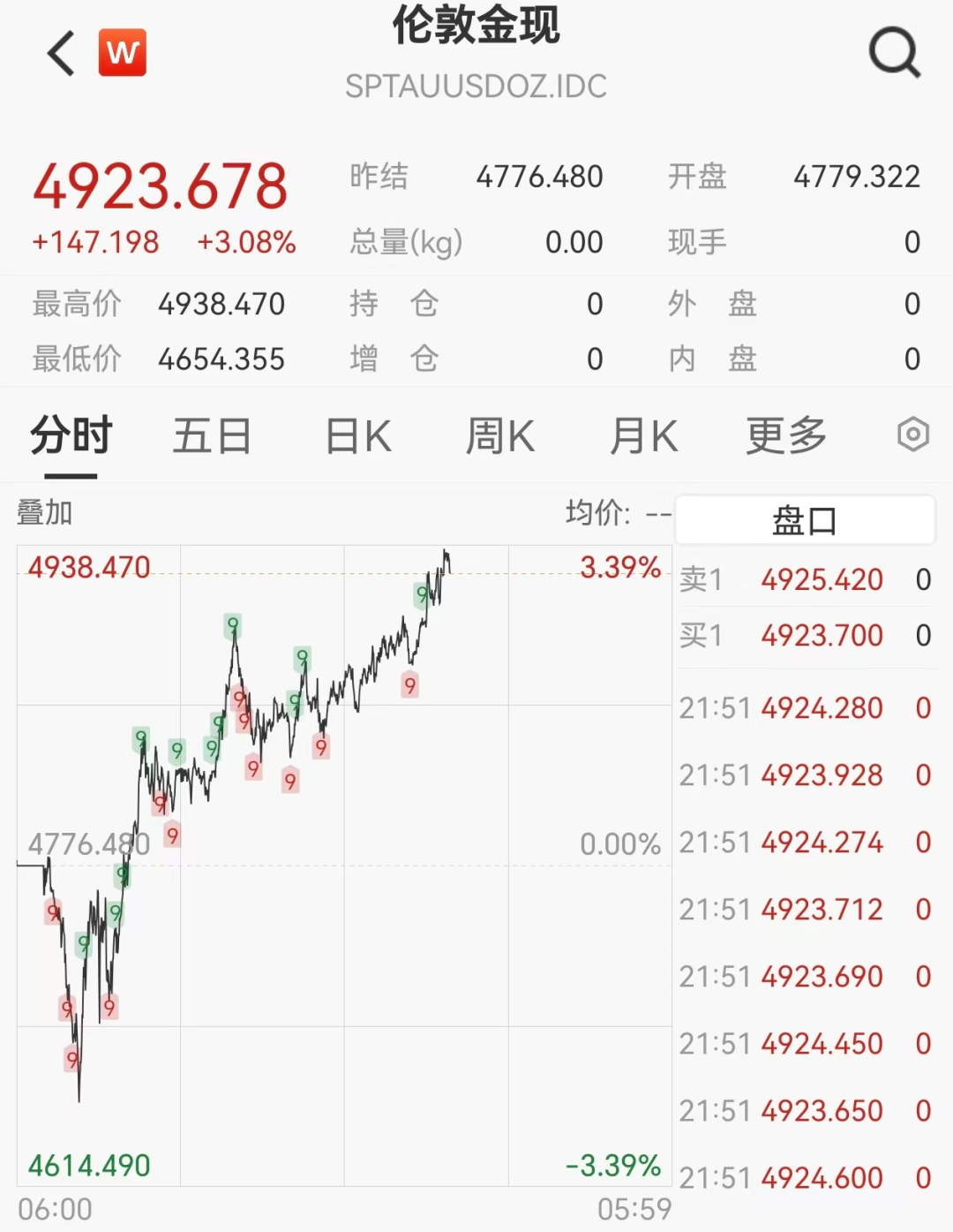 2月6日晚,贵金属快速拉升,截至发稿,现货黄金涨超3%,在4920美元/盎司上方;现货白银涨超7%,约75.25美元/盎司。