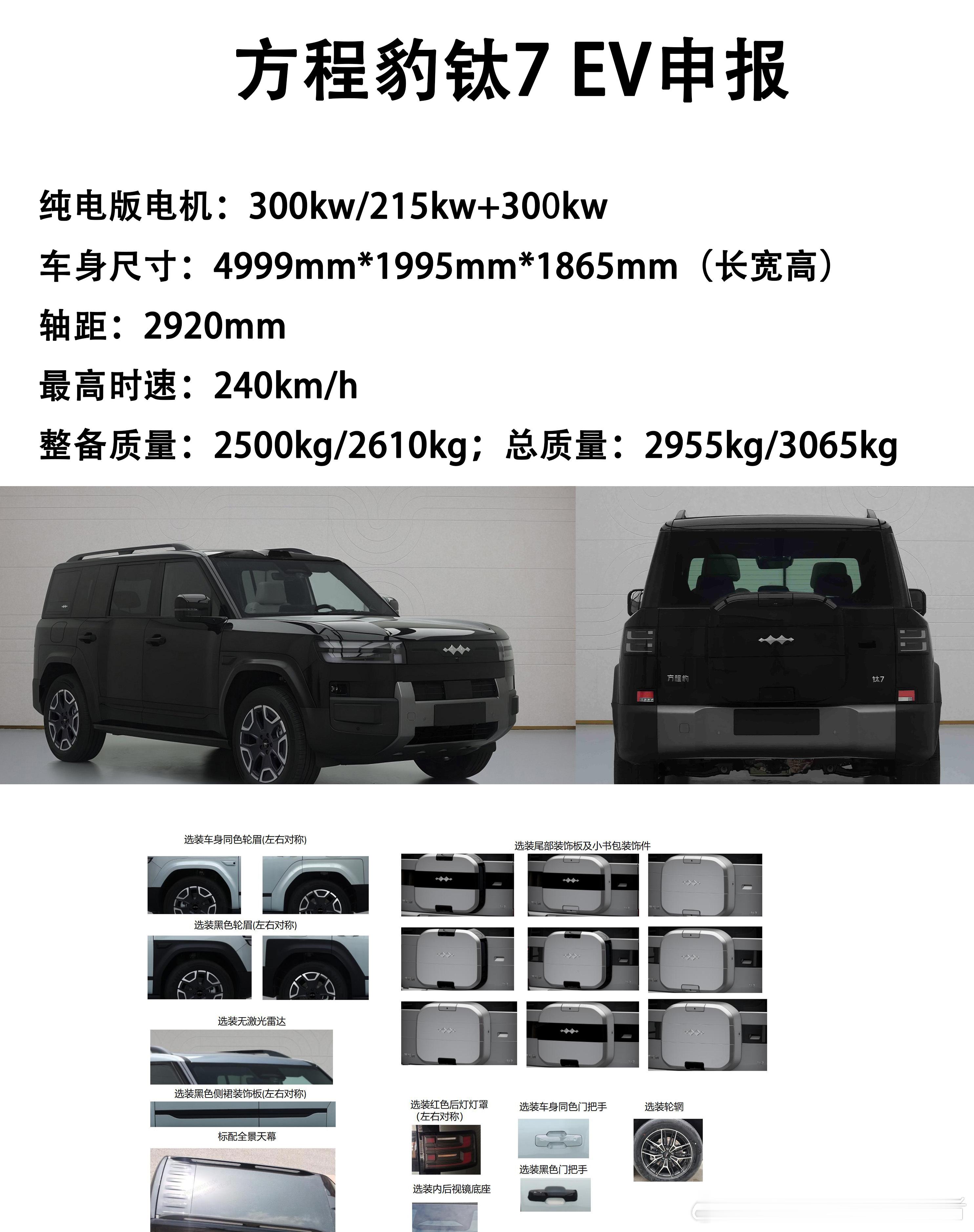 方程豹钛7 EV版本,尺寸方面4999mm*1995mm*1865mm,轴距2920mm。电机方面,有300kw单电机、215kw+300kw双电机两个版本,整备质量整备质量:2500kg、2610kg。现在唯一在意的就是纯电续航以及它的技术配置。