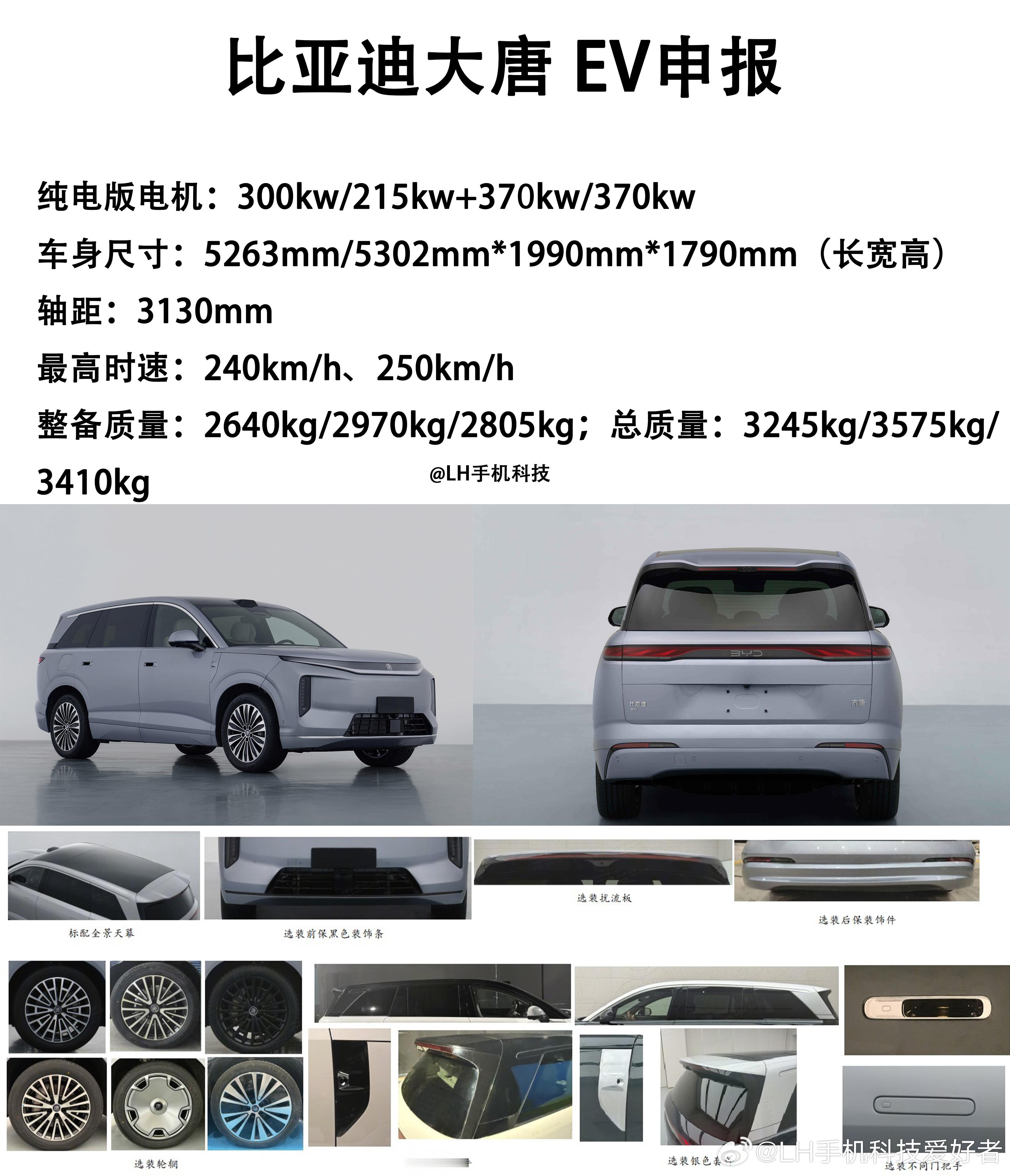 比亚迪大唐纯电版,车身尺寸5263mm/5302mm*1990mm*1790mm,轴距3130mm。电机有300kw单电机、215kw+370kw双电机、370kw单电机三个版本,极速240KM/h。整备质量,整备质量:2640kg、2970kg、2805kg。