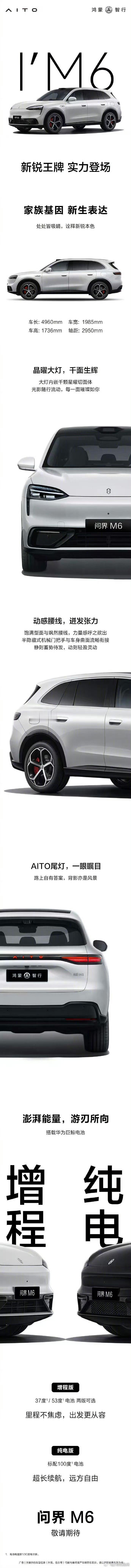 问界M6工信部公示问界M6黑武士版曝光问界M6现身工信部第404批车辆新产品公示清单。新车定位中大型SUV,车身尺寸为4960×1985×1736mm,轴距2950mm,提供增程、纯电双版本。增程版搭载1.5T增程器+双电机,纯电版基于800V高压平台,标配100度华为巨鲸电池。