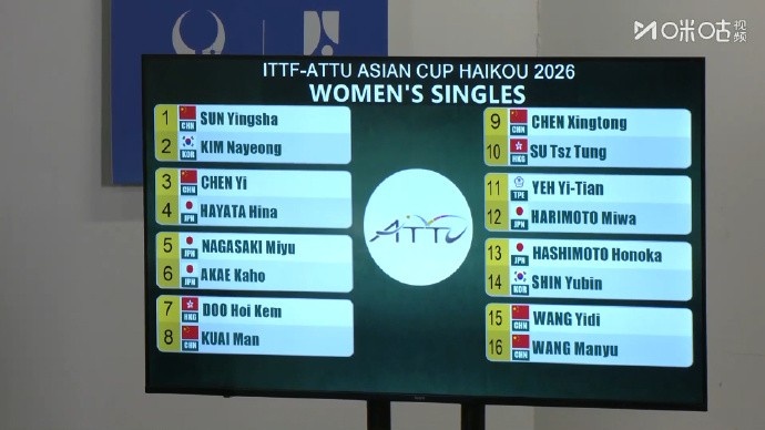 海口亚洲杯女单16强对阵:孙颖莎vs金娜英,王艺迪vs王曼昱