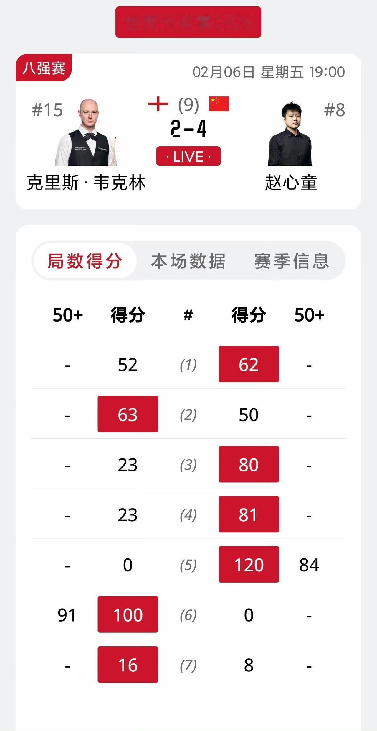 晚上这两场1/4决赛打得太抽象了…… 周跃龙3-1领先卡特进入中场休息,机长随即打出两杆同样的单杆88分扳平。 前四局赵心童和韦克林似乎迷上了防守,两人没有一杆单杆50+,尽管赵心童4-2领先韦克林。看起来会像昨晚塞尔比被逆转那场一样。