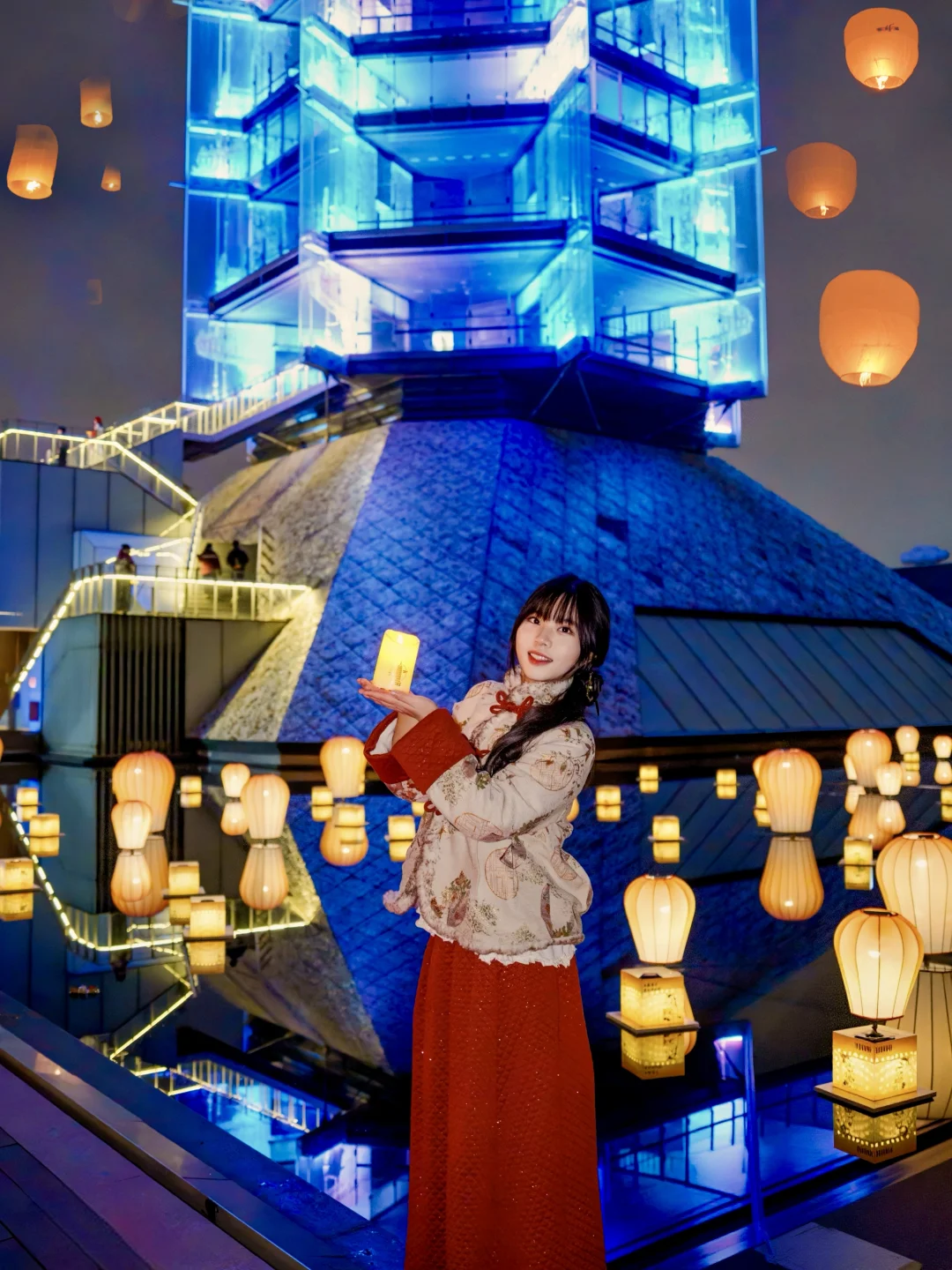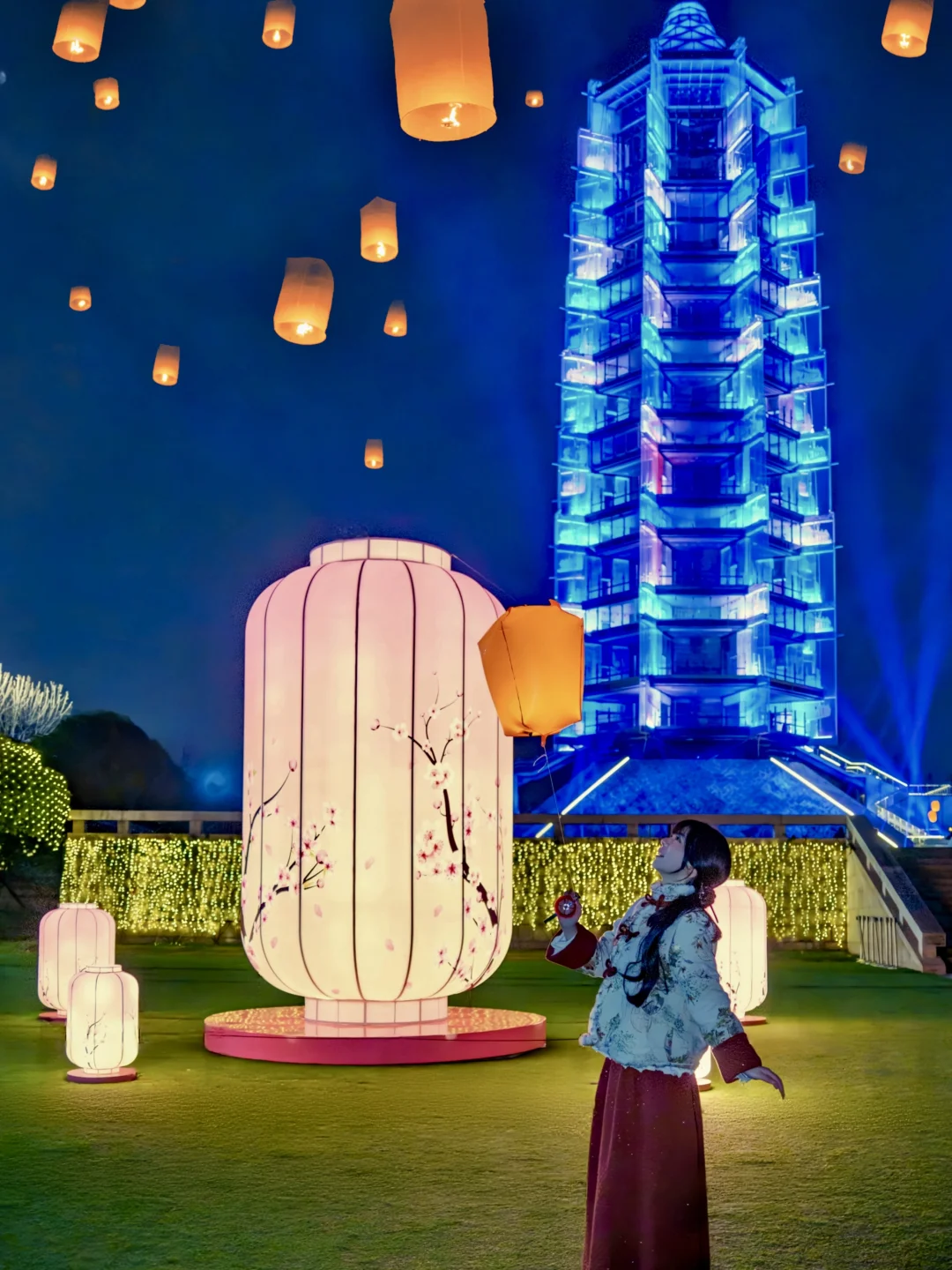 ✔️亮灯后的塔前广场:人物手拿孔明灯,或者手捧心灯,在亮灯的大报恩塔和新中式氛围灯组前面拍。