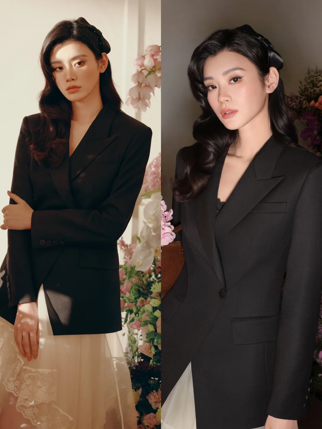 1️⃣ 廓形西装+蕾丝背心+网纱半裙