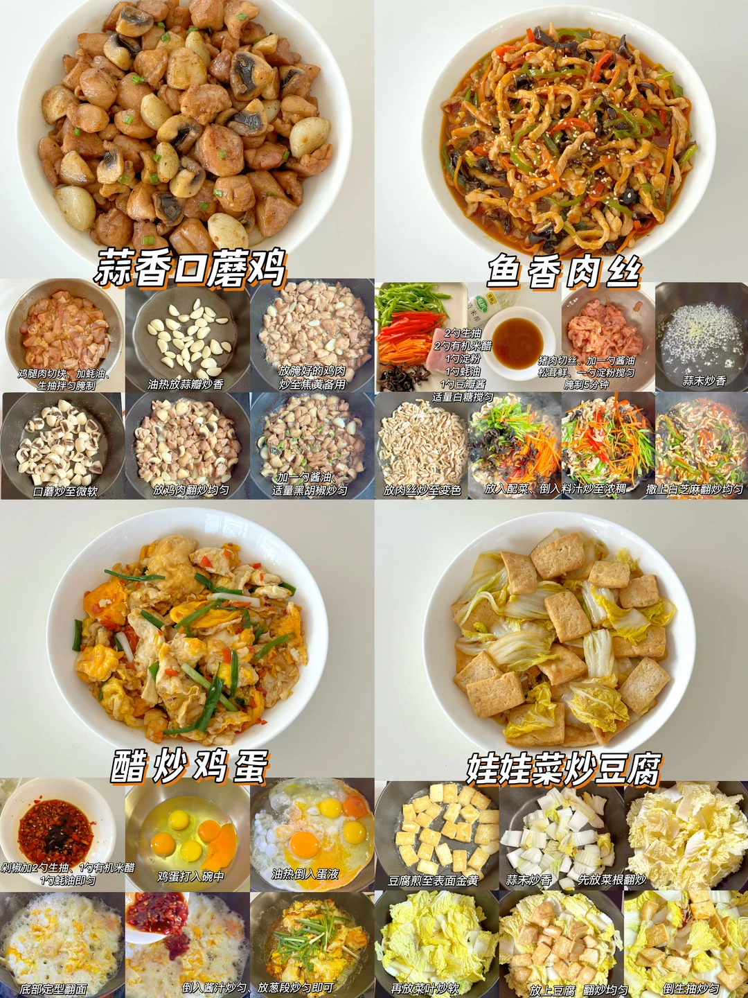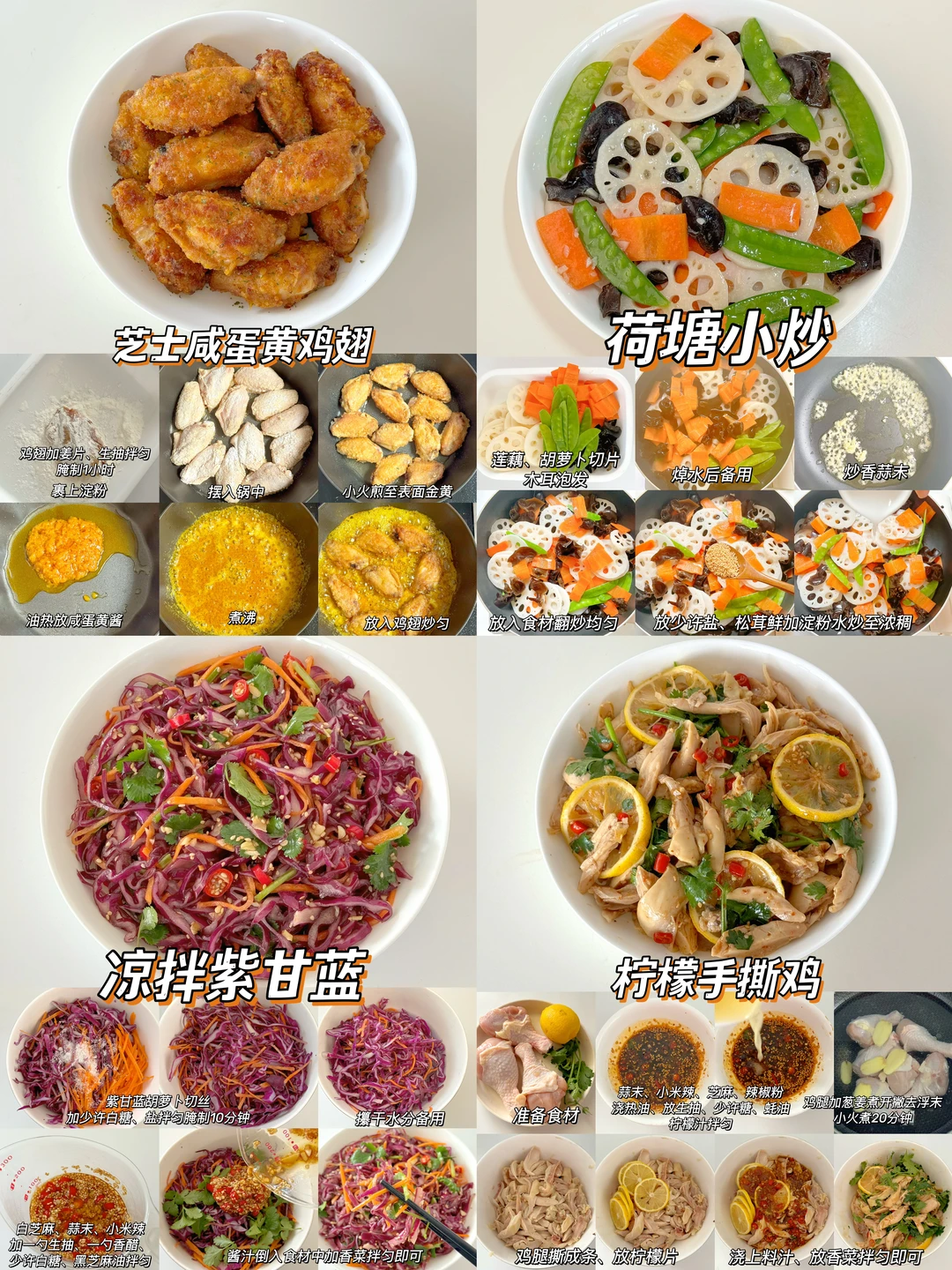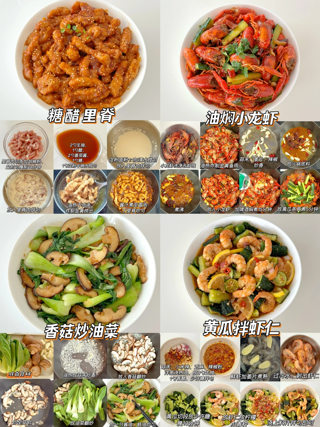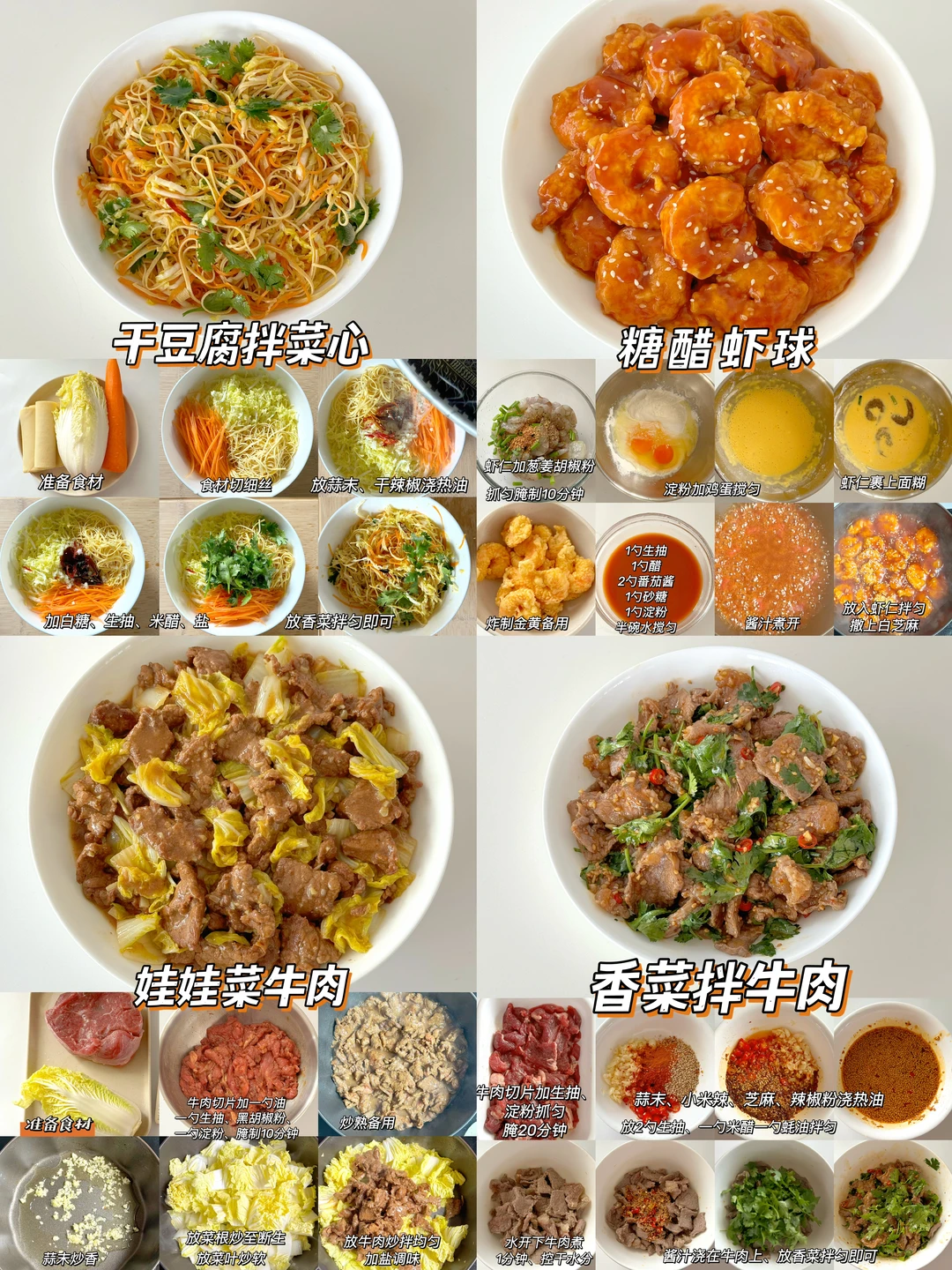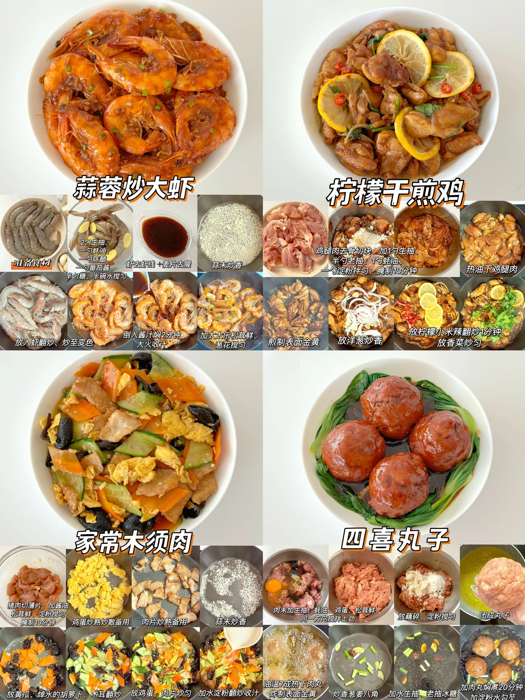 🌈新年的脚步越来越近了,超适合年夜饭的家常菜来了,做法简单,美味可口,年夜饭必备 ✅什锦炒虾仁 ✅糖醋樱桃肉 ✅柠檬干煎鸡 ✅西葫芦炒肉 ✅番茄炒花菜 ✅青椒炒土豆 ✅爆炒花蛤 ✅黄瓜拌虾仁 ✅干豆腐拌菜心 ✅柠檬手撕鸡 ✅香菜拌牛肉 ✅青椒炒火腿 ✅醋炒鸡蛋 ✅醋溜白菜 ✅鱼香肉丝 ✅糖醋里脊 ✅蒜蓉炒大虾 …… ❤️详细做法可以参考图片哦 ❤️调味料可根据自己的喜好添加 ❤️新年即将来临,提前祝大家生活如年夜菜般有滋有味,多姿多彩,幸福美满