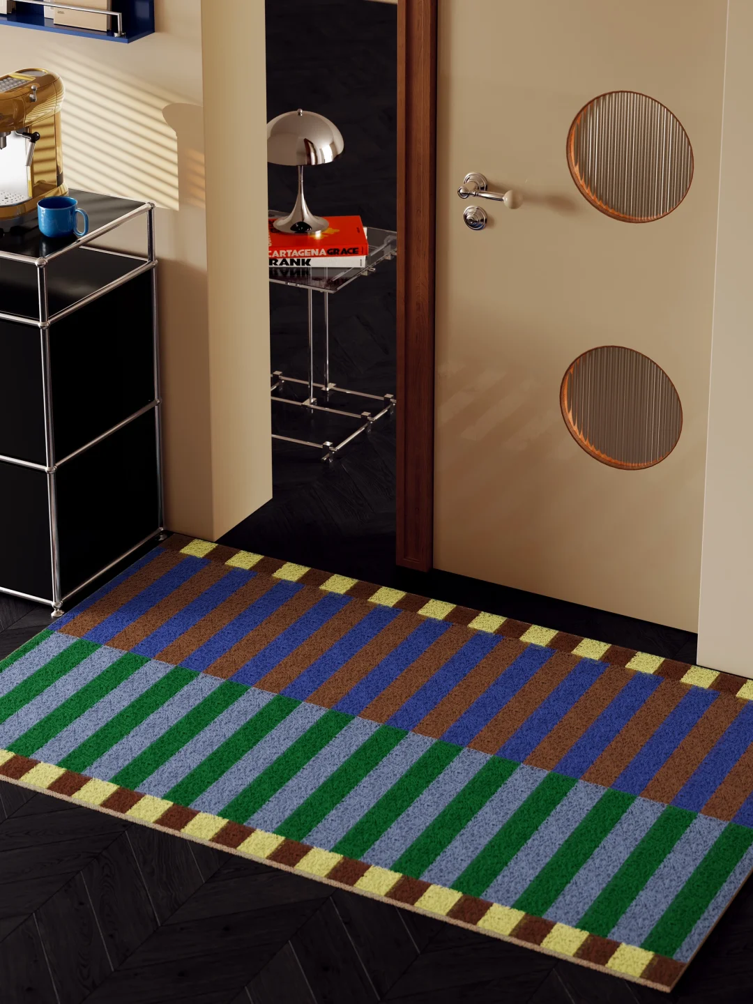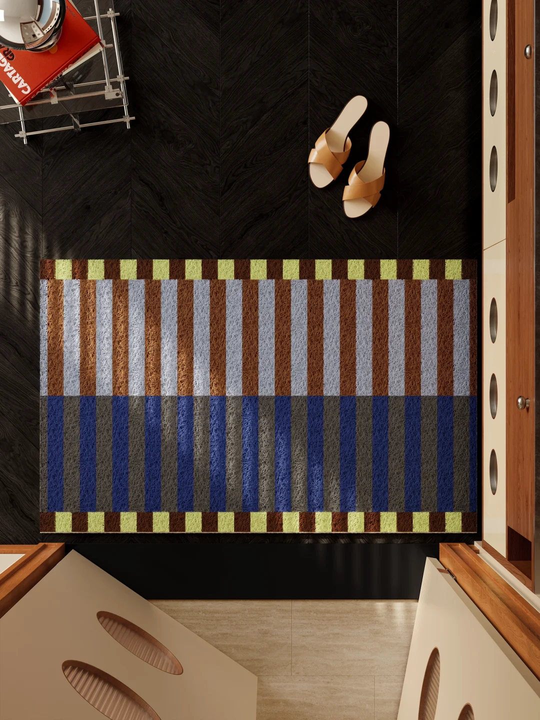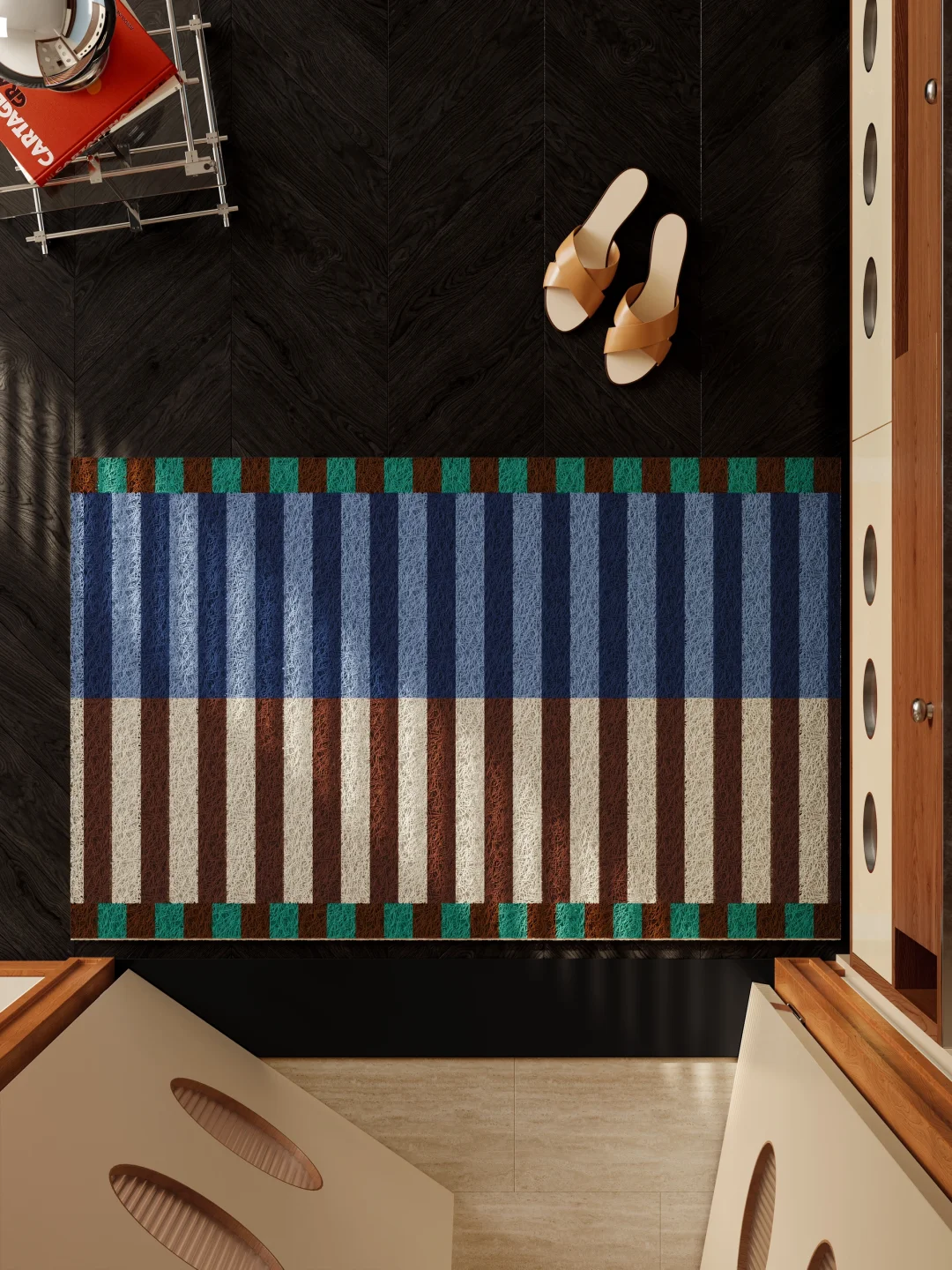 当柯布西耶蓝与复古棕条撞在一起 入户门就不再是普通的过渡区 而是一场现代主义美学的开场 打破传统入户垫的沉闷 用高饱和色块与利落条纹重构视觉秩序 蓝调的冷静中和了棕条的复古 边缘的绿块又添了几分跳脱的活力 铺在玄关,每一次归家 都是从喧嚣世界踏入艺术空间的仪式