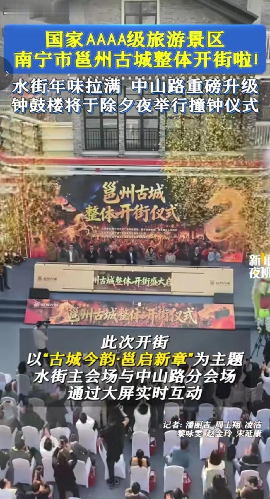 2月6号国AAAA级景区南宁邕州古城完成扩容并举行整体开街仪式,中山路、水街与三街两巷正式连片,形成南宁规模最大的历史文化古城集群,成为该景区全新的核心打卡地,现场也是年味十足。(来源于@新闻夜班)