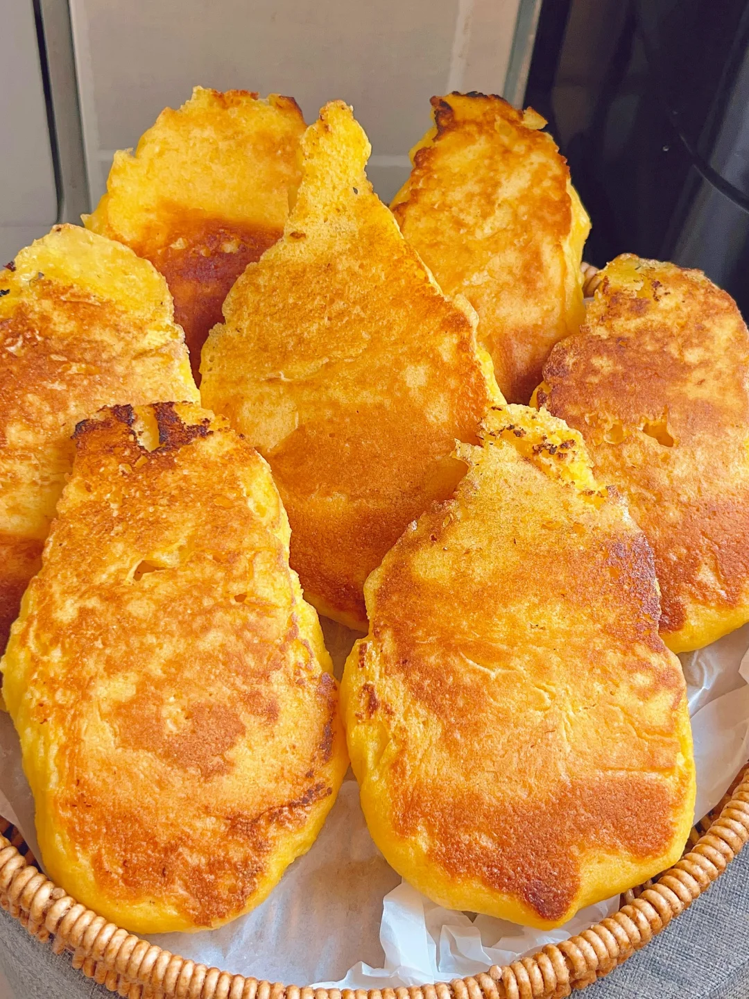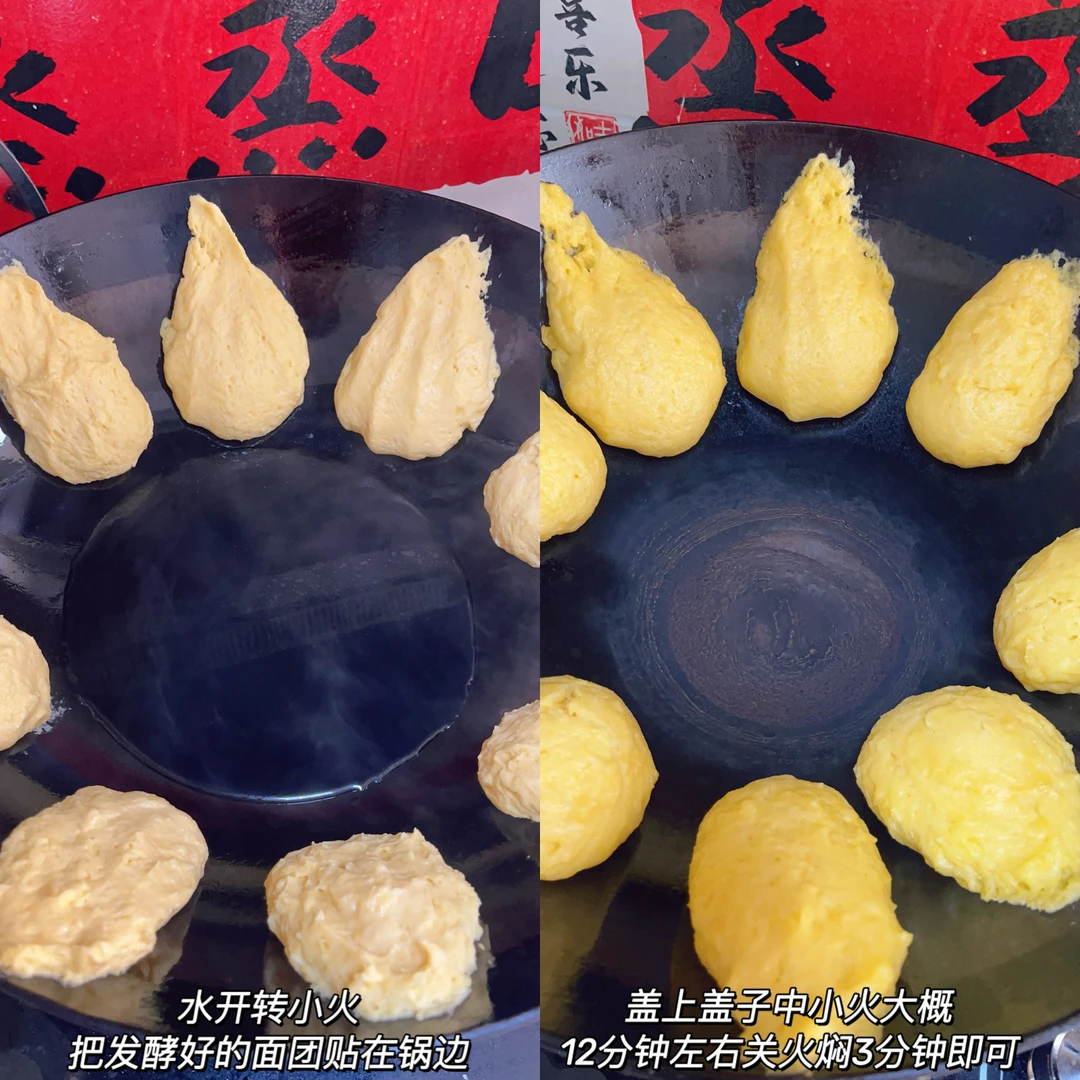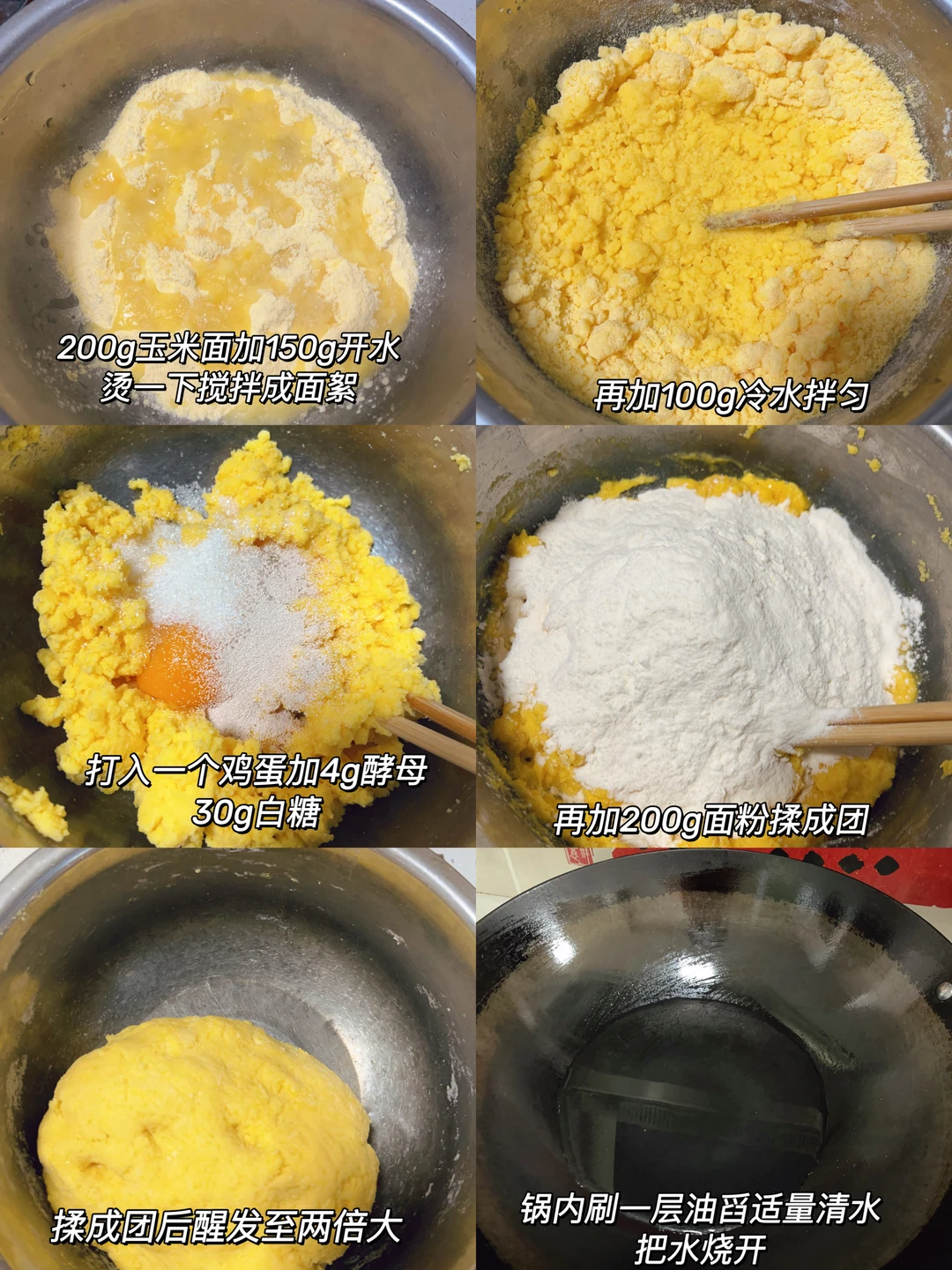 超香的玉米贴饼子,香香软软的一股子的玉米香味 [清单R]食材 250g玉米面、150g开水、100g冷水、1个鸡蛋 30g白糖、4g酵母、200g面粉 [清单R]步骤 1⃣️250g玉米面先用150g开水烫面搅拌成面絮,再加100g冷水拌匀 2⃣️晾凉的玉米面中加酵母白糖鸡蛋面粉揉成团,发酵至两倍倍大 3⃣️锅内刷油舀一碗水烧开,然后把发酵好的面团贴在锅边,盖上盖子中小火12分钟左右焖3分钟出锅