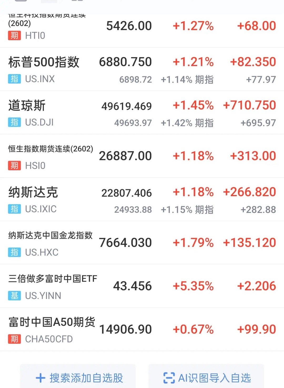 A股。利好来了,下周大涨,必定大涨。我亲爱的家人们,外围暴涨,你们还恐慌吗?我一直给你们说的,年前红包来了,你准备好了吗?周五冲高回落,在洗一下盘,不就是给下周,预留上涨空间吗?恒生科技期货、三倍做多、纳斯达克金龙、外围A50期指、报复性拉升。下周抄底的人,大口吃肉,下周满嘴流油。今晚恒生科技期货暴涨1.44%,富时A50暴涨0.77%,三倍做多中国暴涨5.84%,纳斯达克金龙暴涨1.90%,下周一必定高开。我文章中连续两天,通知你们抄底。我昨天在4050点,今天在4030点,通知抄底,你们不该给我点个赞吗?村长,喊你们回来,给你们发红包🧧了。