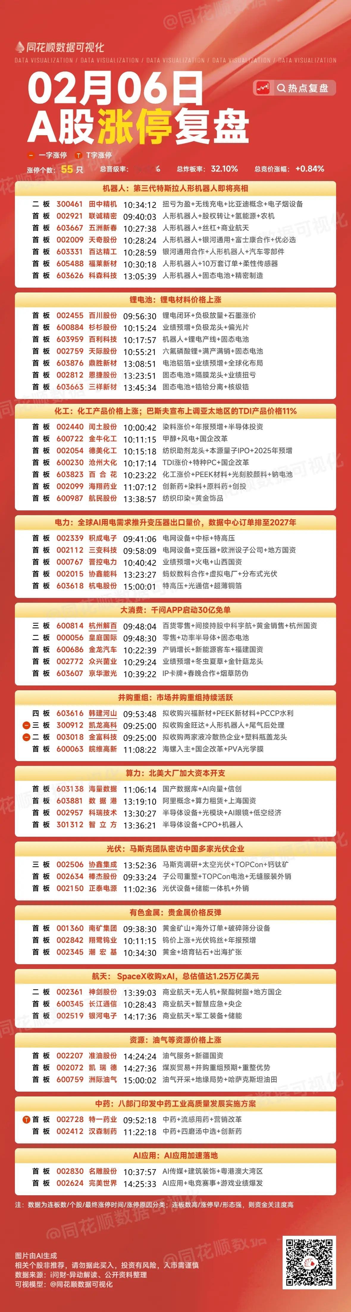 2月6日,涨停复盘(55只),包括机器人、锂电池、化工、电力、大消费等板块。
