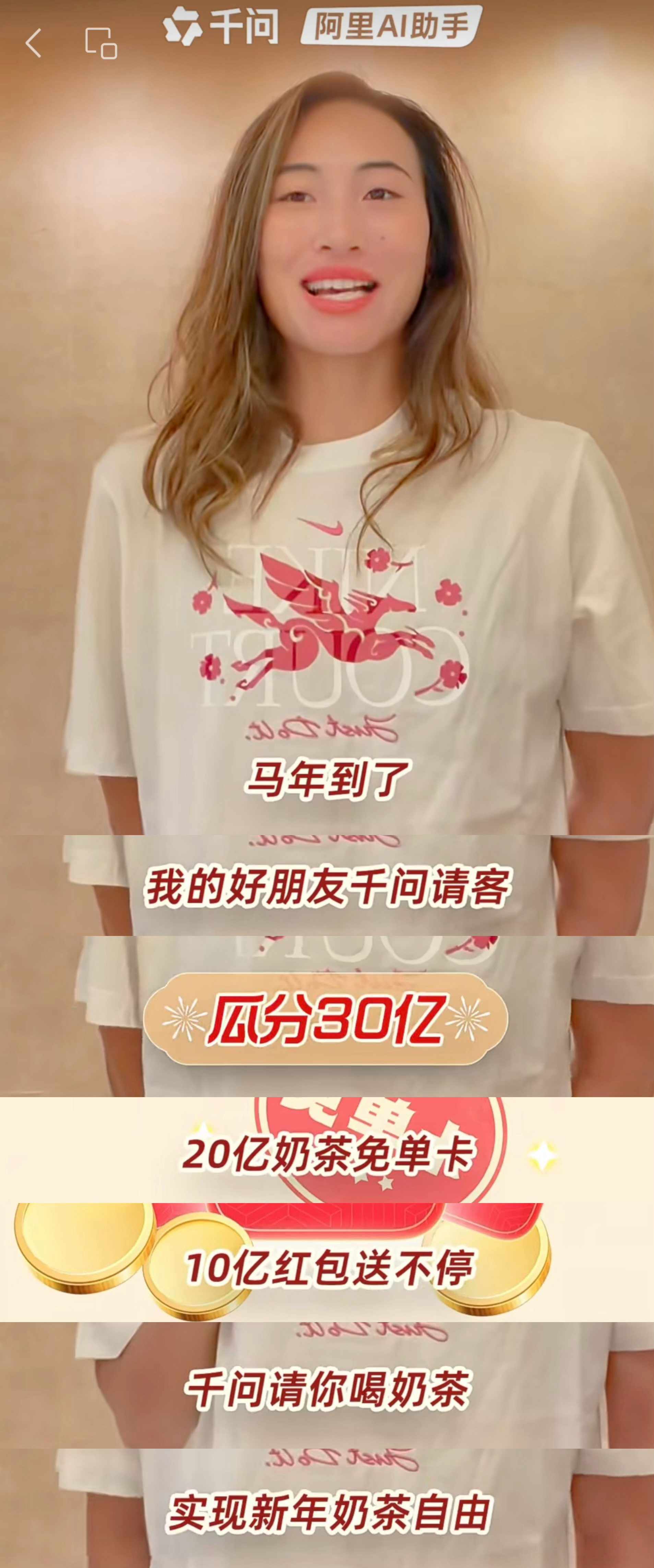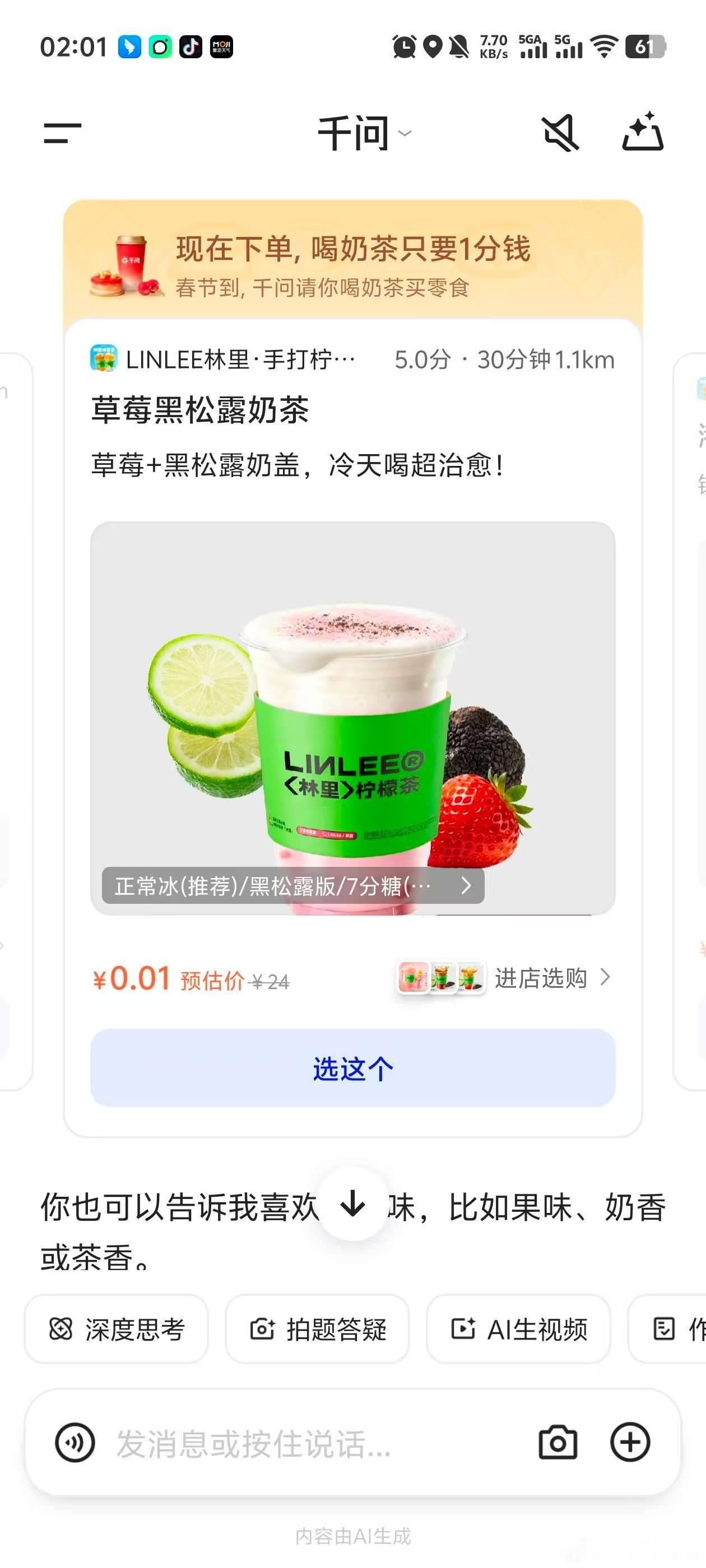 郑钦文喊你上千问AI一句话下单没想到她代言的千问AI都能直接点奶茶点外卖了!我高低得来试试这个千问免单,主打一个紧跟冠军步伐,刚才下载千问,发现直接拿到了25元免单卡,太爽了吧!听说不止奶茶,外卖猫超盒马好多品类都能点!邀请新人还能得更多免单卡!现在就叫上我的上班搭子,赶紧囤起来!