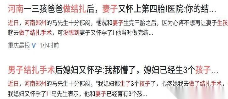 河南郑州,马先生手里捏着两张纸。 一张是医院的化验单,上面白纸黑字写着“精子数量:0”。另一张,是妻子刚用过的验孕棒,上面是两条红得发紫的杠。 他把两张纸并排放在桌上,来回看了三遍,屋里安静得只听见自己的心跳。 这事儿的开头,其实是为了心疼老婆。 老婆已经剖了三个,肚子上一道疤叠着一道疤。医生说,再来第四刀,风险太大。马先生一咬牙,自己上了手术台,替老婆把这个险给挡了。 手术很顺利。一个月后复查,结果清清爽零,医生直接在微信里给他发了条“金牌令箭”:以后不用避孕了。 就这七个字,像一把钥匙,打开了家里所有的大门,把所有的小心和提防全都请了出去。 日子就这么踏踏实实地过着。 直到前几天,老婆的例假迟迟没来。他心里咯噔一下,嘴上还说着“不可能”,手已经把验孕棒递了过去。 结果出来,他脑子“嗡”的一声。 他抓着那根验孕棒冲回医院,要求再查一次。新的化验单打出来,他盯着上面的数字,每一个都像一个巴掌。精子数量、活力,全都恢复到了正常水平。 医生给出的解释,像科幻片一样:那根被切断的输精管,自己长好了,通了。 这叫“自然复通”。一个小到几乎可以忽略的概率,就这么砸在了他家屋顶上。 医院那边倒是承认,但一谈到责任,话就开始打转,只说“这个问题确实存在,可以协商”。 最拧巴的是什么?他当初挨那一刀,就是为了不让老婆冒着风险怀第四胎。结果现在,刀白挨了,那个风险,分毫不差地又摆在了老婆面前。 现在,要么冒险生,要么流产,横竖都是一刀。 马先生对着医院的墙,半天没说出话。 最后,夫妻俩一商量,留下吧。还能怎么办呢?大概有些事,就是人算不如天算。 你费尽心思关上了一扇门,结果命运,直接给你拆了堵墙。