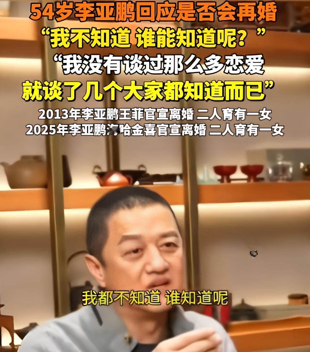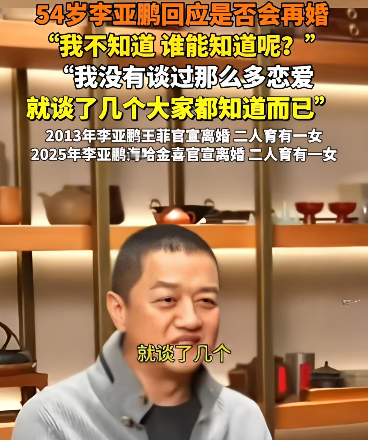 提到是否再婚, 李亚鹏竟然这样说! 最近,倒霉蛋李亚鹏突然火了。 嫣然儿童医院保住了,直播事业也热度高涨。 照这个节奏走下去,李亚鹏在女性心里的魅力会坐火箭式上升。 于是,朋友好奇问他:“还结不结婚?” 李亚鹏老实惯了,说:“我不知道,谁知道呢?” 作为中年已婚老阿姨,我竟然从李亚鹏的话里,听出了他对婚姻还有期待。 不然,以他的直男性格,一定会说,不结了,以后就陪陪闺女,做点喜欢的事。 但他却模棱两可,说不知道是否还会再婚。 怎么感觉他会和汪峰一样,再遇到心动的异性,依然会继续恋爱结婚呢? 李亚鹏和汪峰同龄,他俩的精力都很旺盛,事业上爱折腾,感情里也有用不完的心气。 多次恋爱结婚这事,对普通男人来说,是负担和消耗。对他俩来说,是快乐和幸福。 你们觉得李亚鹏会再婚吗?欢迎留言讨论!