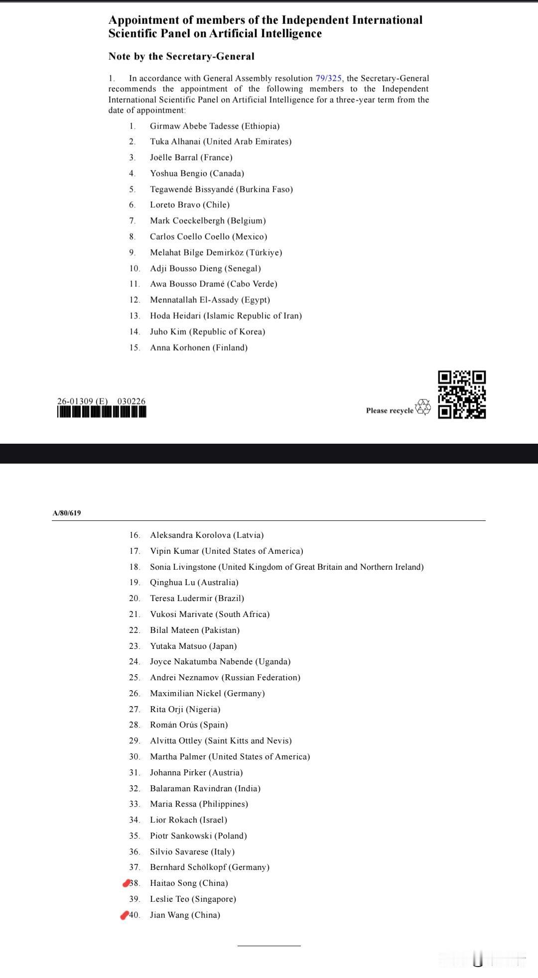 2026年2月4日,联合国秘书长古特雷斯向联大提交了人工智能独立国际科学小组(Independent International Scientific Panel on AI)的首届40名专家名单,中国的王坚和宋海涛位列其中。 该小组由来自全球各地的40位杰出专家组成,旨在反映性别平衡和地理多样性。王坚是中国工程院院士,云计算专家。他是阿里云的创始人,主持研发了中国首个自主研发的云操作系统“飞天”。宋海涛是上海人工智能研究院院长,上海交通大学教授。他同时担任联合国工业发展组织全球工业人工智能联盟卓越中心总干事。 作为首个全球独立的人工智能科学机构,该小组被定位为“世界一流的证据引擎”,旨在弥合全球人工智能知识鸿沟,并对人工智能对经济、社会和人权的影响进行科学评估。 成员以个人身份独立任职,任期为三年。首份报告预计将于 2026年7月 提交,以支持全球人工智能治理对话。 此外,名单中还包括图灵奖得主约书亚·本希奥(Yoshua Bengio)和诺贝尔和平奖得主玛丽亚·雷萨(Maria Ressa)等知名人士。