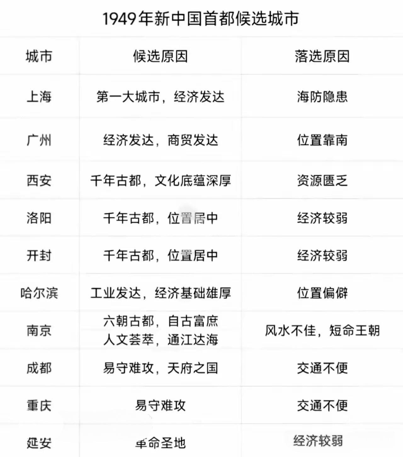 新中国成立前夕,有关新中国首都选址的问题,早在西柏坡时期便已开始酝酿。图一是曾被考虑过的10个城市;图二展示了这10个城市的入选原因与被否定原因。