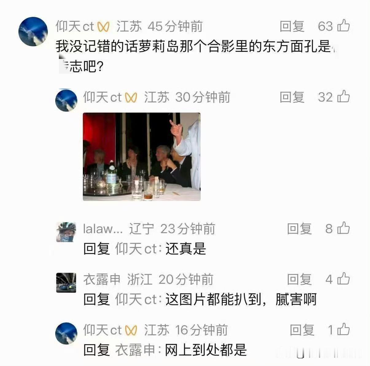 我去!又是猛料?有完没完啊?[捂脸] 图片显示和爱泼斯坦坐在一起的聊天的长得像一个亚洲人?要说揭秘(图三),那就揭秘的更悬乎了?真不敢相信!其实,这图片也不像是p的,就是老早的图片嘛。 这个爱泼斯坦大坏人,搞金融的人,到底全世界当年认识了多少富豪?有权贵的人。爱泼斯坦性侵案