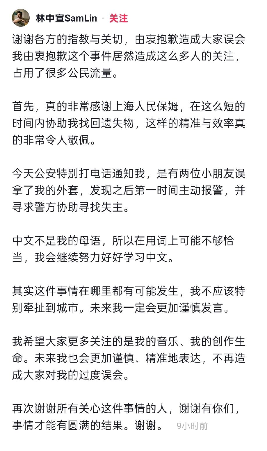 台湾十八线歌手林中宣对在上海丢失羽绒服一事道歉:因为中文不是我的母语,所以我用词不是很恰当! 起因是这个所谓歌手林中宣在来上海演出的时候,去卫生间,把价值一万多且昨天新买的羽绒服放在外边的洗手台上。等他出恭后,发现羽绒服丢了。 丢了这么贵(相当于两三千人民币)的羽绒服,林中宣很是愤怒,爆出一句经典美国国骂后,就疯狂吐槽“在美国没见过这种事”“以后再也不来上海”等等。然后还装好人“要是你需要我可以送给你,为什么要偷呢?” 旁边有个他朋友所谓上海本地人,还在那起哄架秧子“快到过年了,有人在这丢过手机…” 后来真相来了:两个小朋友误拿了羽绒服,发现拿错就报警寻找失主了,所以羽绒服不久就被送回给林中宣。林中宣高兴了,还趁机宣传自己是一名歌手和自己的新歌。 网友不干了!你给我大上海贴这样的标签后,然后又推你的新歌?你是不是自导自演?谁要听你这种人的歌! 在强大的舆论下,林中宣说他很后悔,主要是因为中文不是他的母语[震惊]他用词不是很恰当。以后再也不会牵扯到特定的某个城市了…… 实话说,我怎么觉得这个道歉有点诚意,但是不多呢?而且主要还是出于担心自己被抵制的考虑呢? 明明是自己疏忽乱放物品,丢了东西不先反思自身,反倒张口诋毁上海、捧踩美国,被戳穿真相后才轻飘飘拿“中文不是母语”当借口,这样的道歉不过是怕丢了内地的饭碗,毫无真心可言,连基本的反思都没有,这样的歌手和作品,谁会买账?