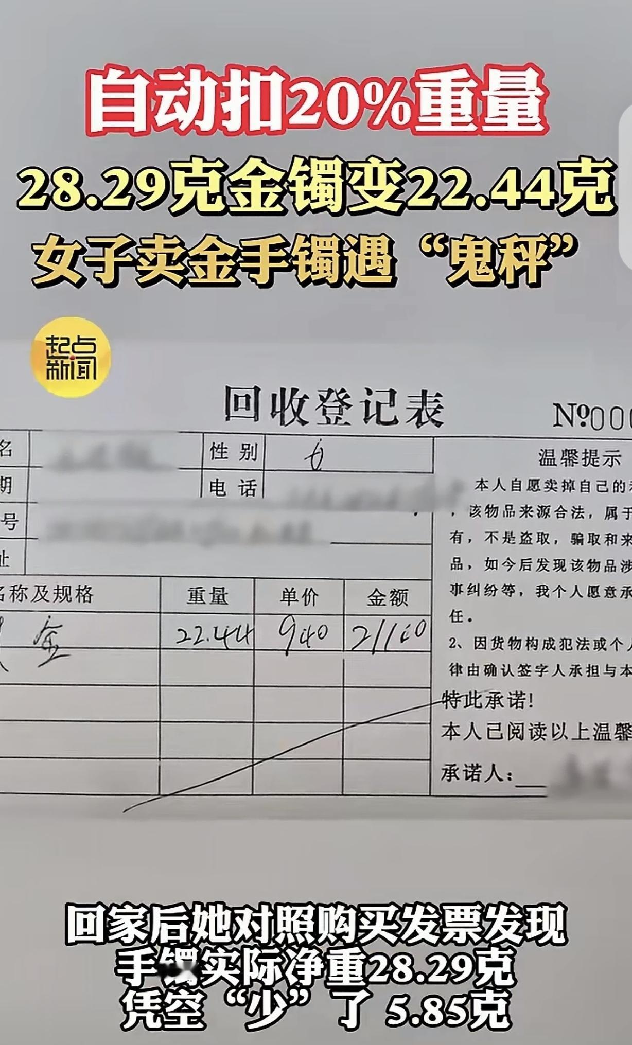 “这胆子太大了!”上海,一女子看金价猛涨,就拿着28.29克金镯子去金店变现,金店却在称上暗做手脚,称出22.44克,直接坑了她5.85克,让女子损失5499元,而不可思议的是,女子当时没发现被坑,回家看到金手镯发票上的克数,才愤怒的报了警。 高女士一看金价猛涨,直接就不淡定了,她多年前买了个20多克的金手镯,她平时也不是个喜欢穿金戴银的人,所以,手镯平时也不戴。 金手镯放在家里,她还怕一个不小心被偷,既然金价涨起来了,何不卖了变现,否则如果金价跌下来自己没抓住机会,那就亏大了。 于是,高女士决定趁着这个好行情,赶紧出手。 高女士拿着金手镯就来到一家金店,跟店员说自己要卖了金手镯。 店员说回收价是940元每克,高女士没有异议,双方一拍即合成交了。 接下来就是称重环节,店员问高女士金手镯多少克?这么多年,具体克数高女士早就忘了,她光记得是20多克,发票落在家里没带来。 高女士让店员直接称重,以称重出来的克数为准。 在她看来,金店里的称肯定准,也不可能缺斤短两,金店没这个胆子,如果金店暗中做手脚,早就被发现了,除了自己粗枝大叶,记不住自己金首饰克数的人并不多。 店员称重后,显示高女士的金手镯重22.44克,有零有整的,高女士一点都没怀疑,拿着21100元就开开心心回家了。 高女士当初买这个金手镯时,可没花多少钱,如今卖了这么多钱,她高兴的不得了。 可回到家,高女士找到买手镯时的发票,顿时傻眼了,发票上写着,她金手镯是28.29克,并非22.44克。 金手镯过了金店的称后,竟然“缩水”5.85克,她直接损失5499元。 可把高女士气坏了,她这么信任金店,竟然被套路了,她一怒之下报了警。 警方去金店调查,发现金店网购非标秤,然后,在秤上做手脚,称重时,就会少20%的重量。 好家伙,这金店胆子不是一般的大,得坑了多少记不得自己首饰克数的人呀,目前,金店老板已被刑拘。 有些人净干投机取巧的事情,自以为聪明的人才是最傻的人,人家买的多少黄金都是有数量的。 有人说,厨房秤非常准,我都先在家用厨房秤称完,再去店里打金,丝毫不差。 有人说,还是500一克的时候,我媳妇去换金饰,就被偷了5克多。后来算上新的手工费,又2500多。里外里5000多。知道后都懒得跟她着急。 现在这样的坑人事,有没有人管?查出来怎么处理商家?商家还有经营的资格吗?这样的事可能哪个商家都出现过,为什么还能经营?是他们这样做合法吗?不合法,为什么还可以经营?什么原因? 金店干这事,真就是把顾客当傻 子耍。仗着有些人记不住克重,买个非标秤暗动手脚,一坑就是百分之二十的重量,赚的全是不义之财。 高女士要是没找到发票,这笔钱就白瞎了,估计金店老板还在背后笑话她粗心。 最可气的是,这种坑人的方式防不胜防。普通人哪能想到金店会在称上做手脚?毕竟在大家印象里,金店的秤都是经过校准的,做生意最讲究个诚信。 结果就是这份信任,成了金店牟利的底气。不少网友说自己也有过类似被坑的经历,说明这种事不是个例,就是抓了大家“不会刻意记克重”“相信商家”的心理。 高女士报警太对了,就是要让这种商家付出代价。真当坑人没成本?卖黄金的人不记克数,难道买黄金的发票也是摆设?这下不仅钱要吐出来,还得蹲局子,完全是自食恶果。 《刑法》第266条规定:诈骗公私财物,数额巨大或者有其他严重情节的,处三年以上十年以下有期徒刑,并处罚金。 金店通过改装秤具故意减少黄金重量,虚构手镯重量事实,骗取高女士5499元,已构成诈骗罪。 金店的行为并非简单的商业欺诈,而是以非法占有为目的的诈骗犯罪,需承担刑事处罚,同时应返还高女士损失的5499元。 对此,你怎么看?