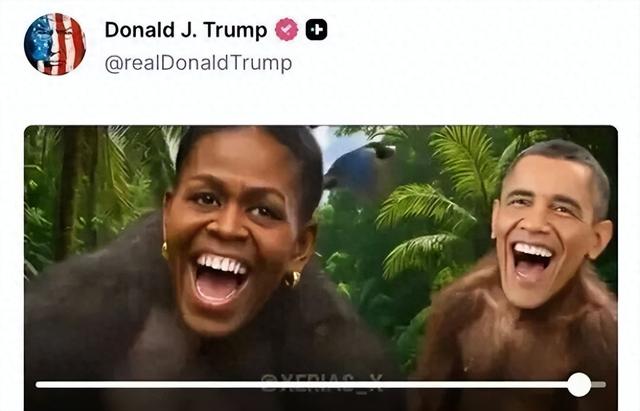 这段视频片段在美东时间5日晚11时44分出现在特朗普的社媒账号上,其中有两个灵长类动物的画面,它们的脸被剪辑成了奥巴马及其夫人米歇尔的笑脸。白宫一名高级官员6日中午对媒体说,此帖为白宫一名雇员“误发”、已被删除。