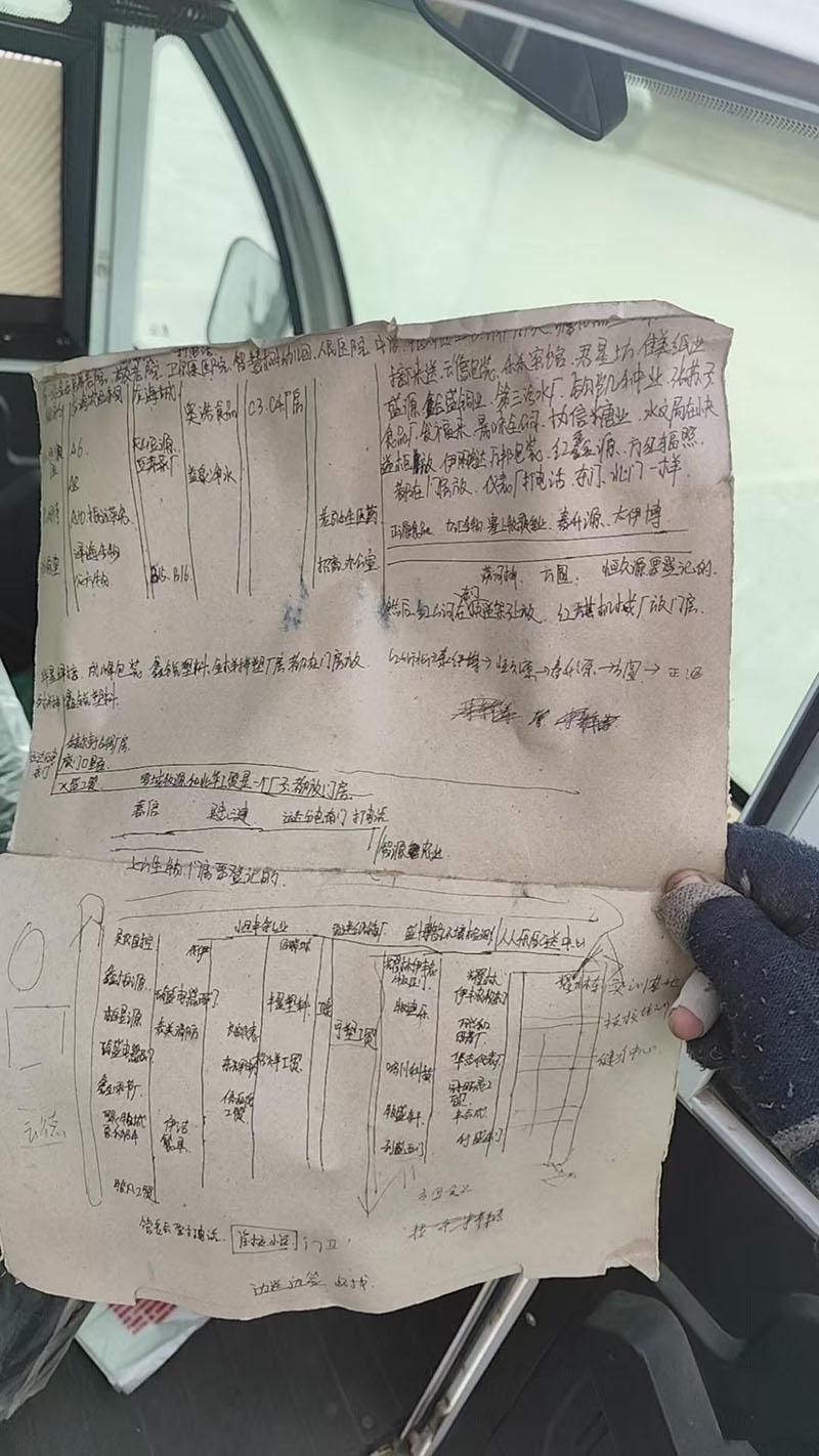“那时候送货全靠嘴问,有时候问错路绕半天,快件送晚了还得跟客户道歉”,朱静涛说。为了不耽误送货,他想了一个办法——手绘地图。