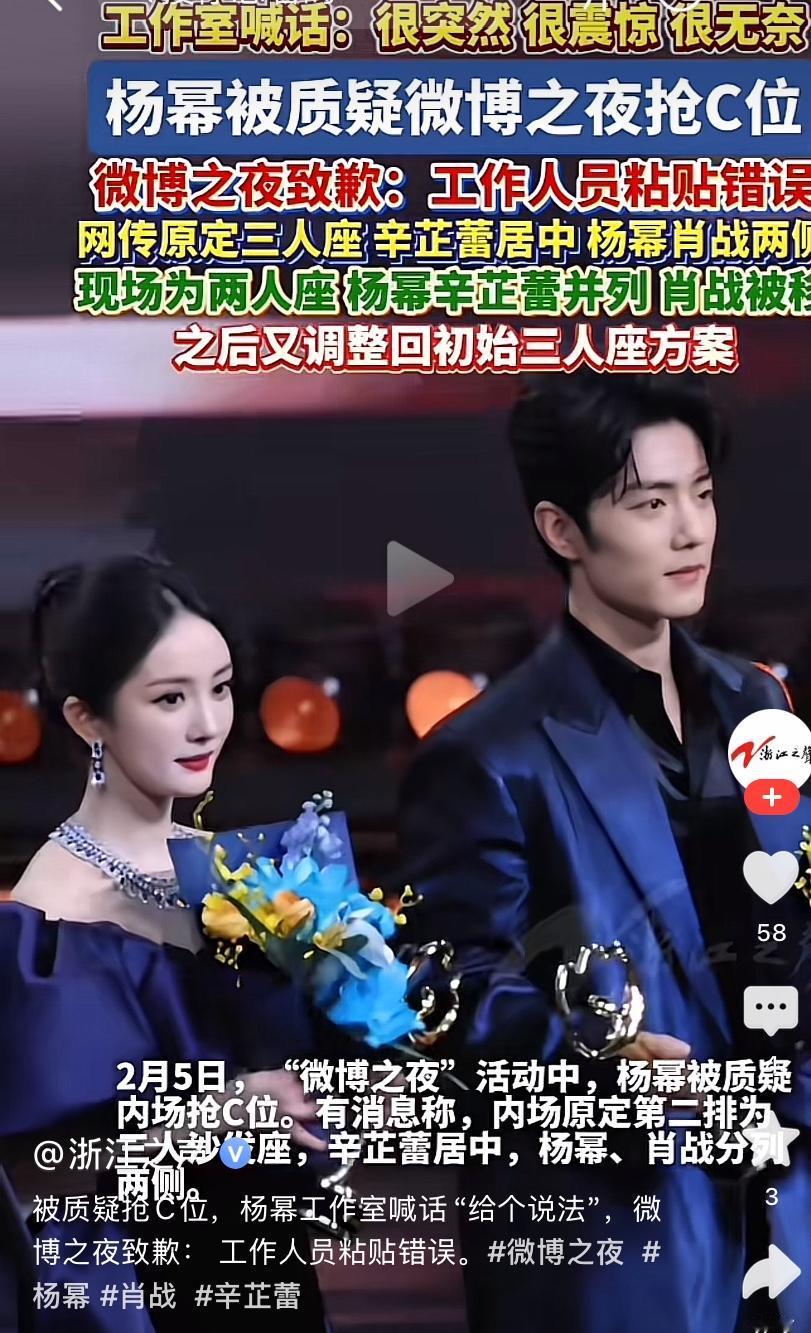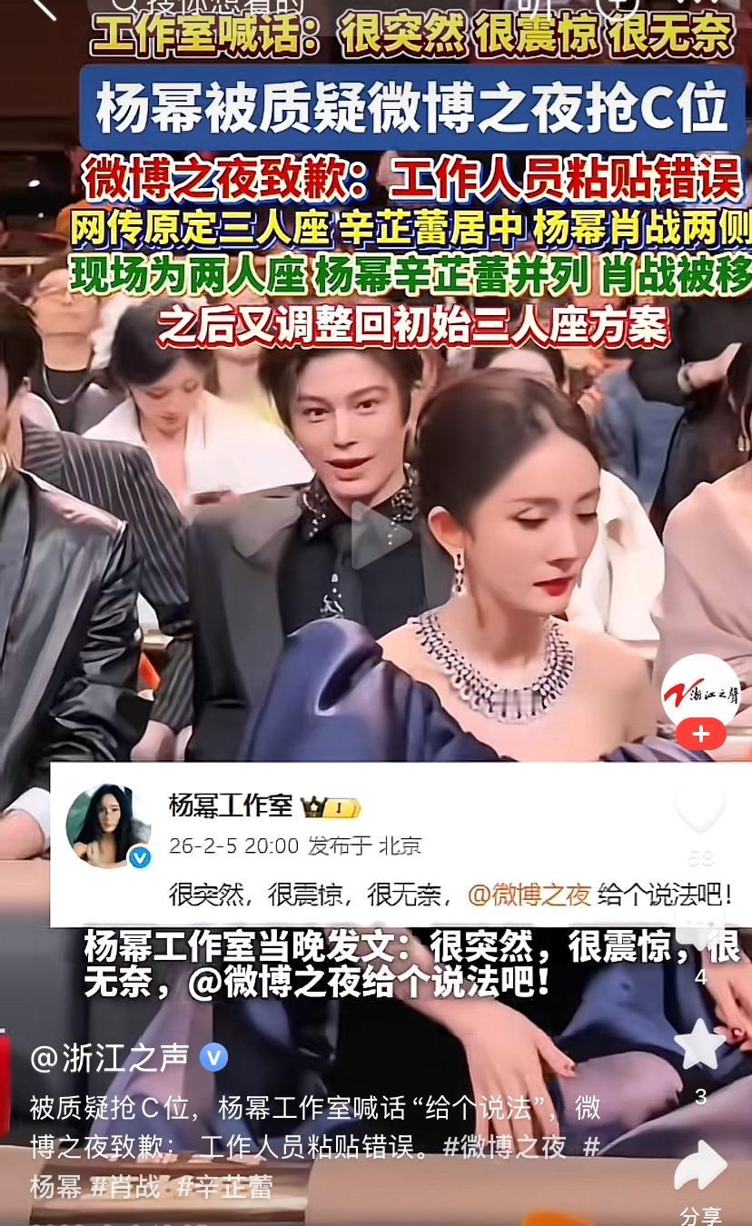 杨幂C位争议,微博之夜道歉 真的笑不活了! 微博之夜公开道歉了! 好好的星光盛典愣是 被C位整成大型闹剧! 原定辛芷蕾居中, 杨幂肖战分坐两侧, 结果开场前肖战名牌被撕, 直接挪去边缘位, 三人座变杨幂辛芷蕾双C, 现场核心区空一大片, 艺人都不敢落座。 杨幂被骂抢C位, 瞬间就上了热搜! 工作室直接硬刚要说法, 肖战粉丝怒怼主办方, 现场观众都喊起了退票。 主办方最后甩锅工作人员粘贴失误, 道歉疑似敷衍推责 网友根本不买账。 说实话,娱乐圈的瓜吃的够够的 一个微博晚会全成了吃瓜现场, 这出戏真的看腻了!