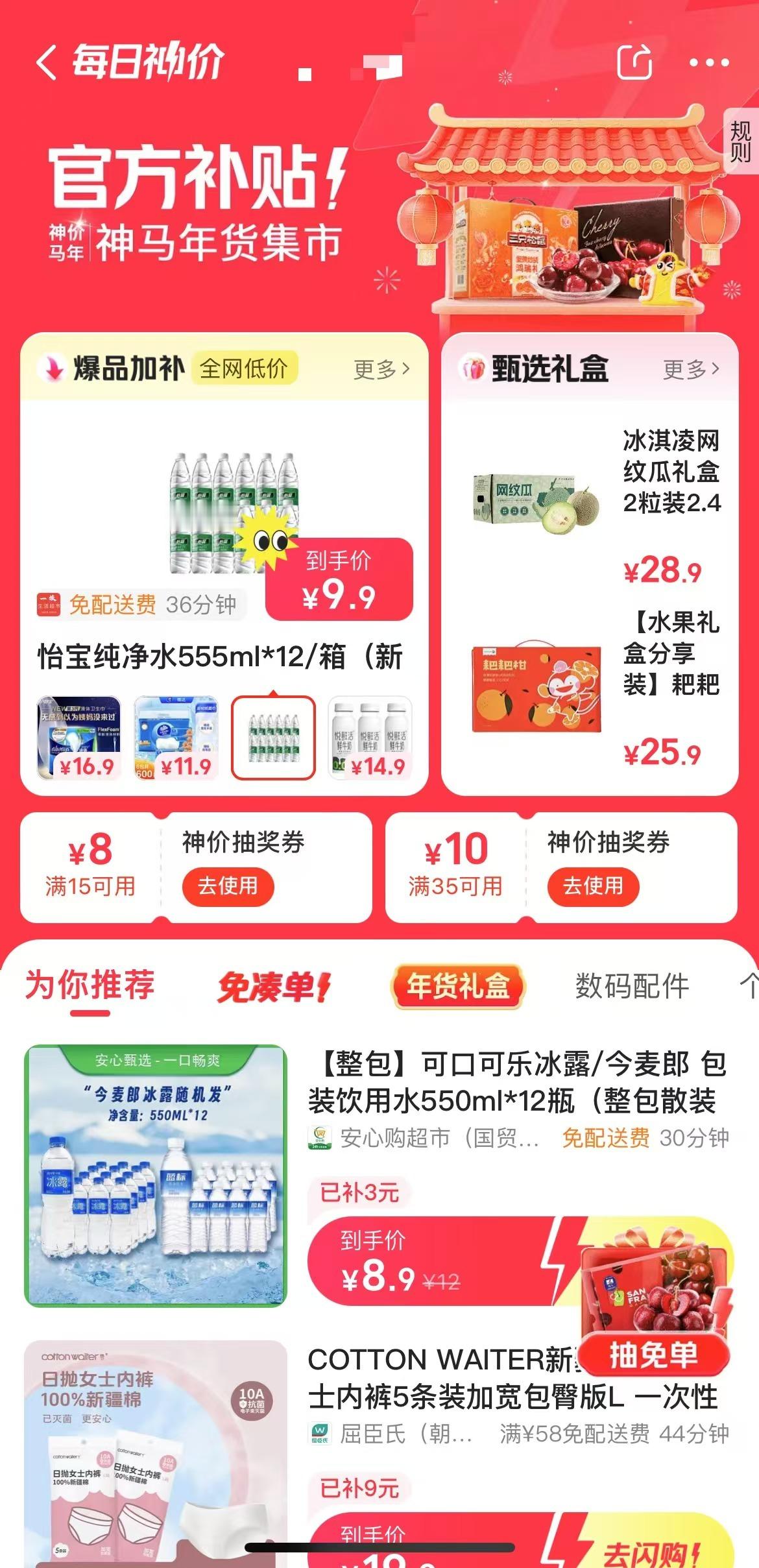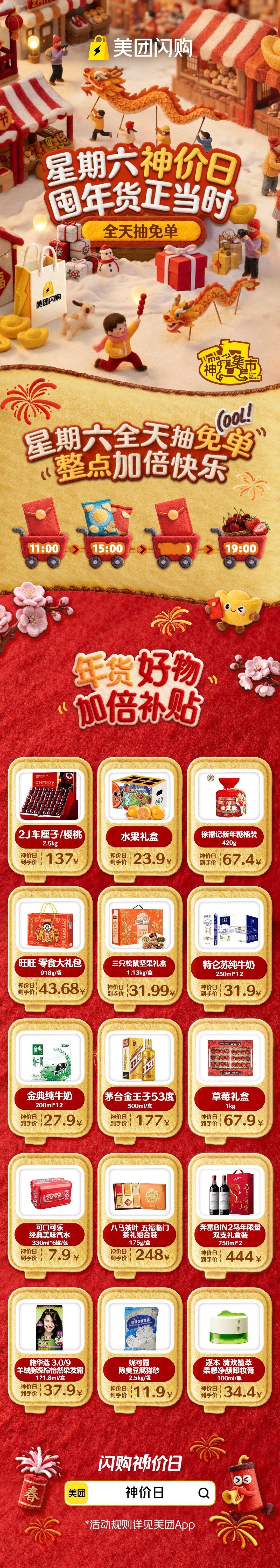 囤年货的家人们看过来,一起抄省钱攻略!打开美团App搜索🔍【神价日】,各种大牌年货应有尽有,从水果礼盒🎁到零食大礼包,都是你想不到的超低神价,补贴力度超乎你的想象,关键都是大品牌,质量有保障,同时在2月7日美团闪购星期六神价日可以参加全天抽免单,蹲好11点、15点、17点、19点这四个整点,加倍快乐!轻轻松松把年货带回家,姐妹们冲就对了!美团闪购神价日抽免单 美团闪购神价日