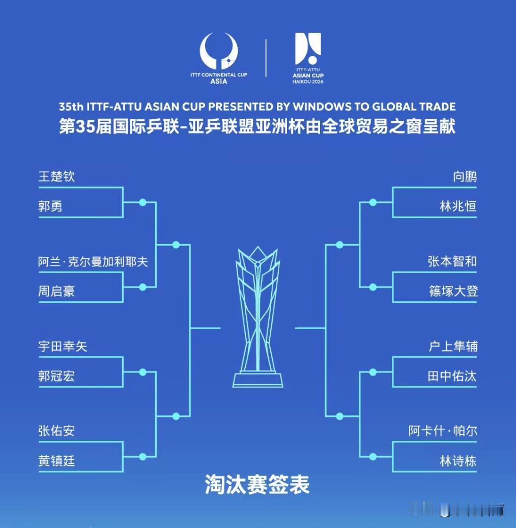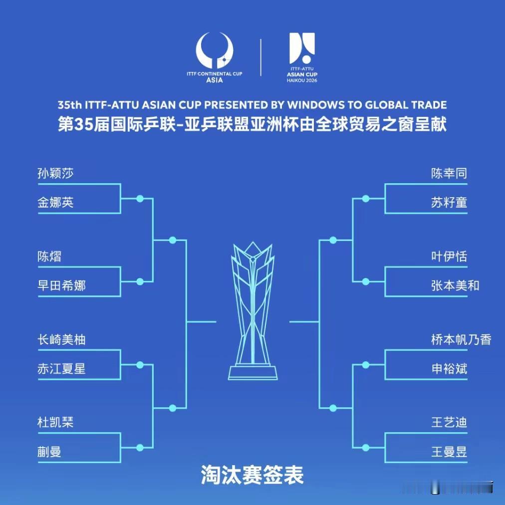 乒乓球亚洲杯从今天开始进入淘汰赛阶段,国乒六男六女的出战阵容中,共有十人晋级十六强,被寄予厚望的两位年轻选手陈垣宇和陈俊菘遗憾出局,而作为国乒本届亚洲杯最大竞争对手的日本队,五男五女全员晋级淘汰赛。 作为赛会的前两号种子选手,王楚钦和林诗栋分别镇守两个半区,他们俩在决赛前都不会相遇,而周启豪在王楚钦的1/4区,两人有可能在1/4决赛相遇,向鹏则是在下半区。 亚洲杯淘汰赛男单具体对阵为: 1/4区:王楚钦vs郭勇、阿兰·库尔曼加利耶夫vs周启豪 2/4区:宇田幸矢vs郭冠宏、张佑安vs黄镇廷 3/4区:向鹏vs林兆恒、张本智和vs篠塚大登 4/4区:户上隼辅vs田中佑汰、阿卡什·帕尔vs林诗栋 亚洲杯淘汰赛女单具体对阵为: 1/4区:孙颖莎vs金娜英、陈熠vs早田希娜 2/4区:长崎美柚vs赤江夏星、杜凯琹vs蒯曼 3/4区:陈幸同vs苏籽童、叶伊恬vs张本美和 4/4区:桥本帆乃香vs申裕斌、王艺迪vs王曼昱 央视CCTV5也将在今天连续直播亚洲杯的1/8决赛和1/4决赛,球迷们一起为国乒队员加油吧!