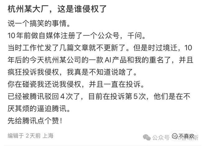 近日,一名公众号博主在社交网络吐槽阿里反向投诉其公众号名字侵权。