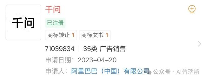 AI普瑞斯查询发现,阿里确实持有千问第35类商标,但获得时间显著晚于该博主注册公众号时间。