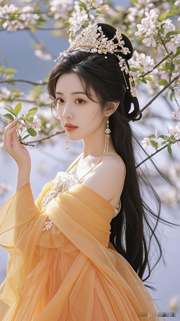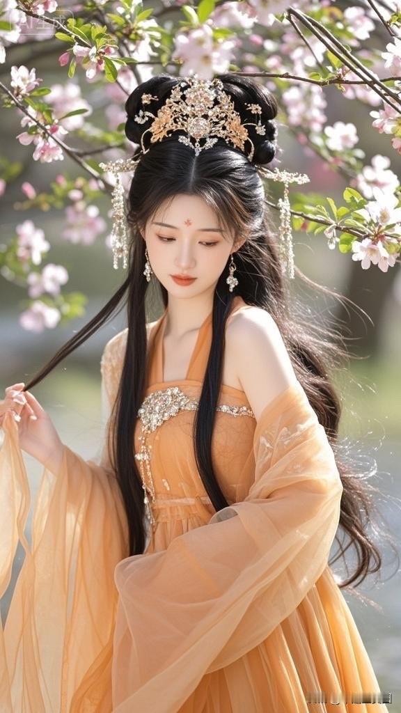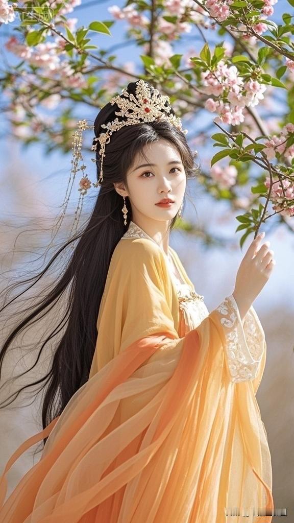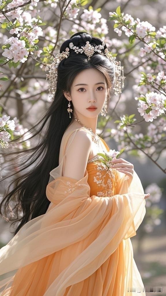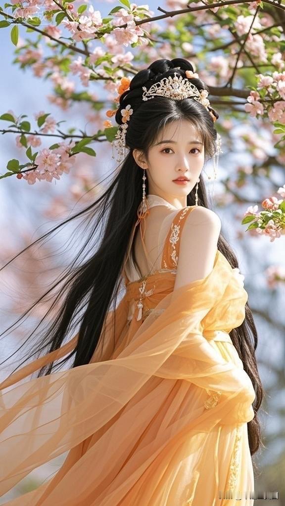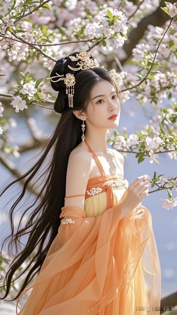 樱花树下,古风美人,一袭橙衣,惊艳时光。