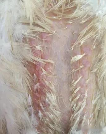 1、是不是湿度高引起的毛囊炎?有时当舍内出现高湿时,比如地面养殖的肉鸡,长期卧在潮湿的地面上,或是网养的肉鸭(肉鸭舍内湿度很容易出现饱和),会出现腹部长期处于潮湿状态下,引起毛囊炎。但是这位朋友是笼养817肉鸡,粪便都能及时传出舍外;且春季湿度一般偏小而不是偏大,所以这种可能性基本排除。
