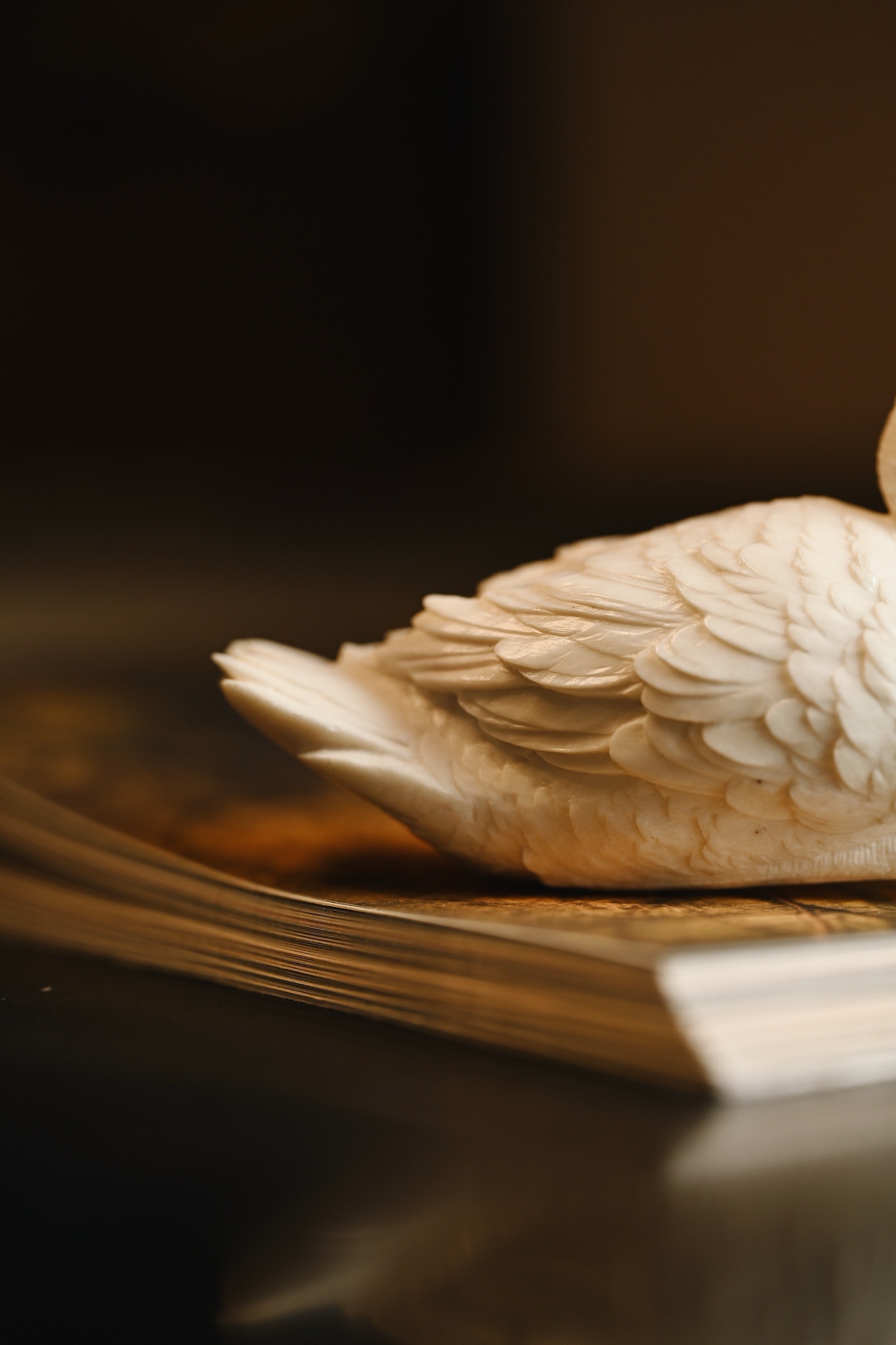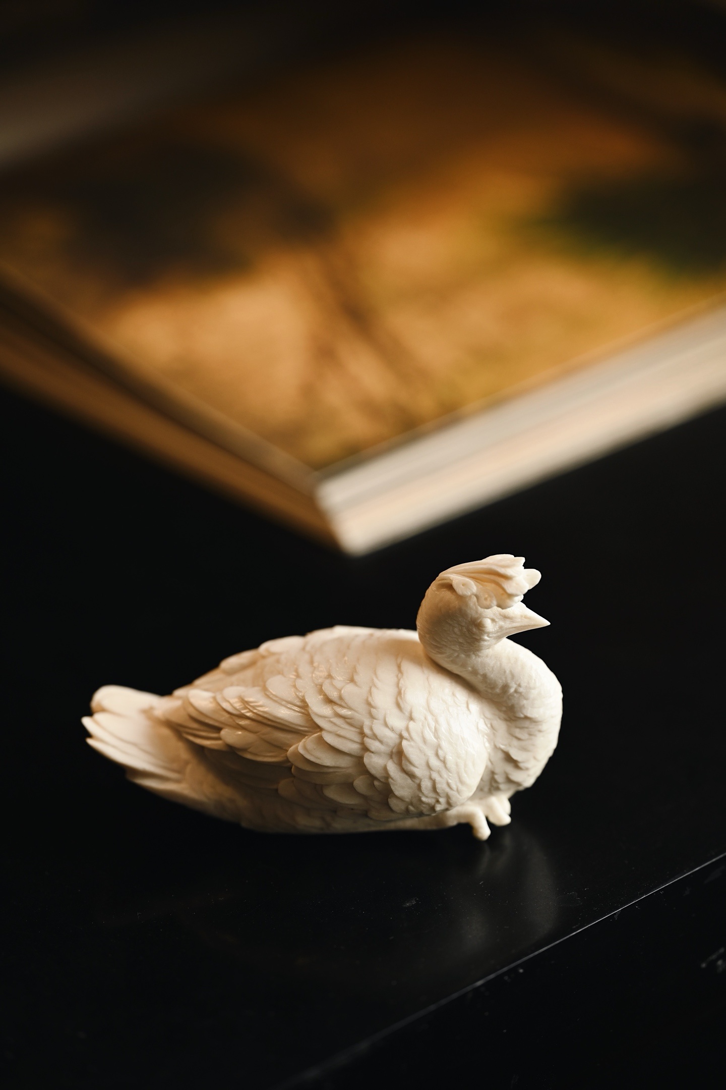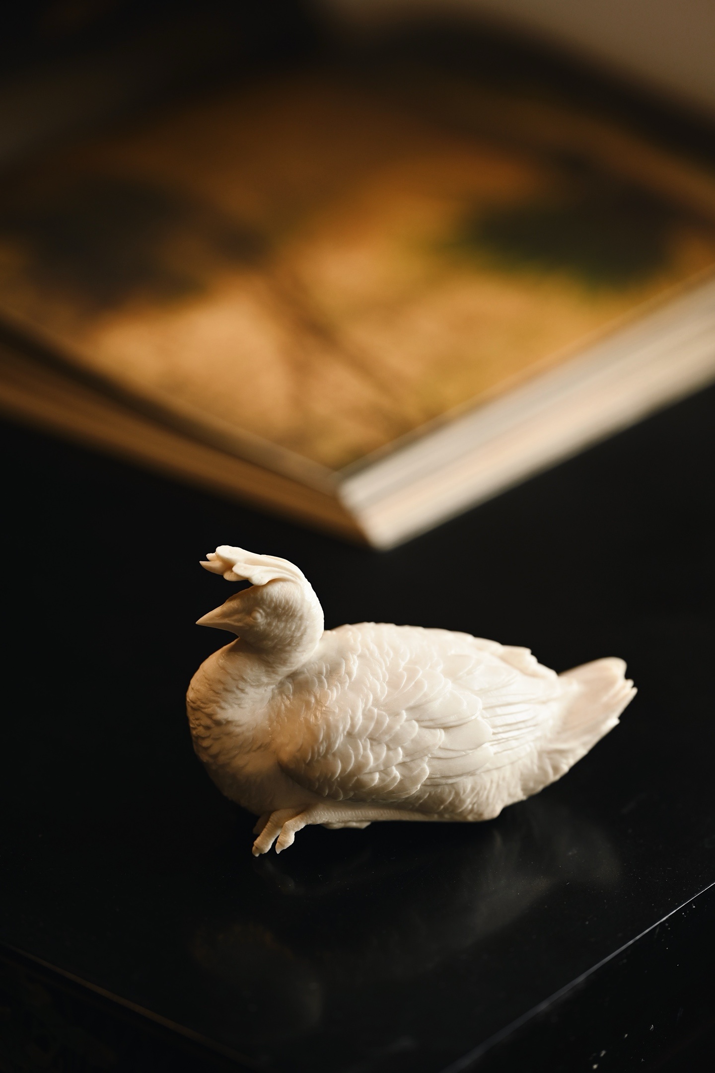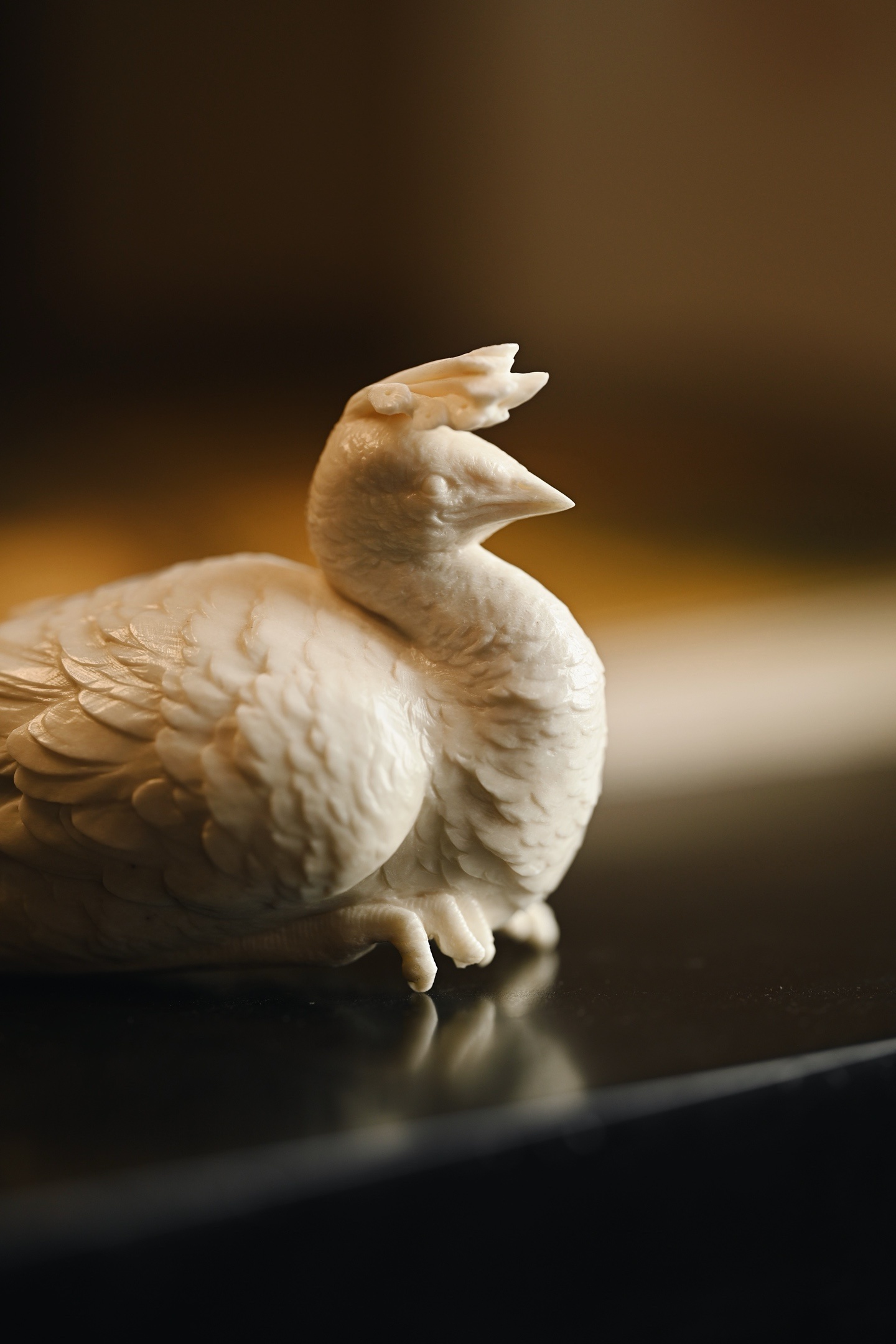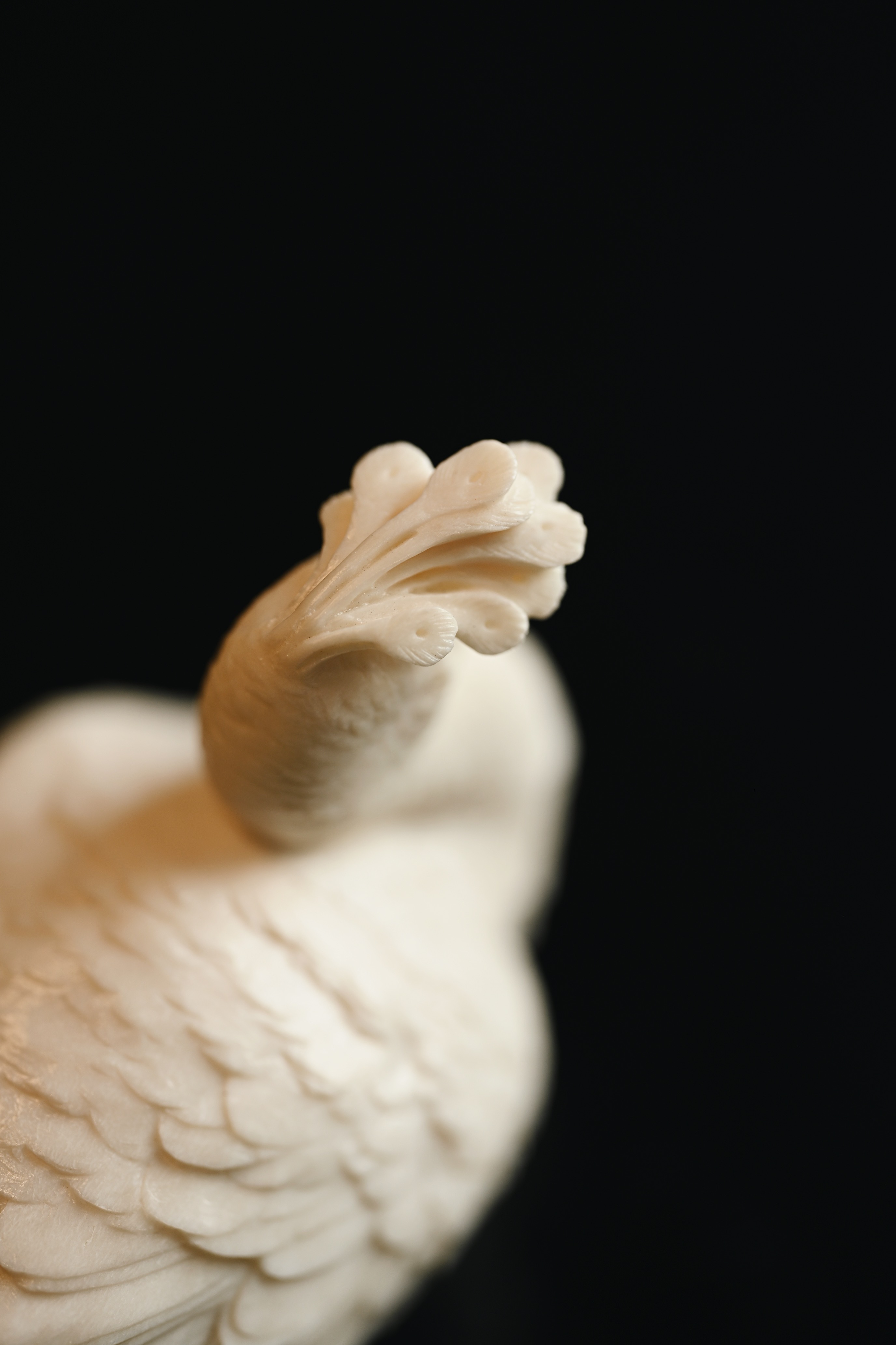 造型劲挺,孔雀神态专注,眼神笃定,尽显其高贵本色,尾部羽毛密而不乱,整体意蕴悠悠,置之案几,清贵祥和。