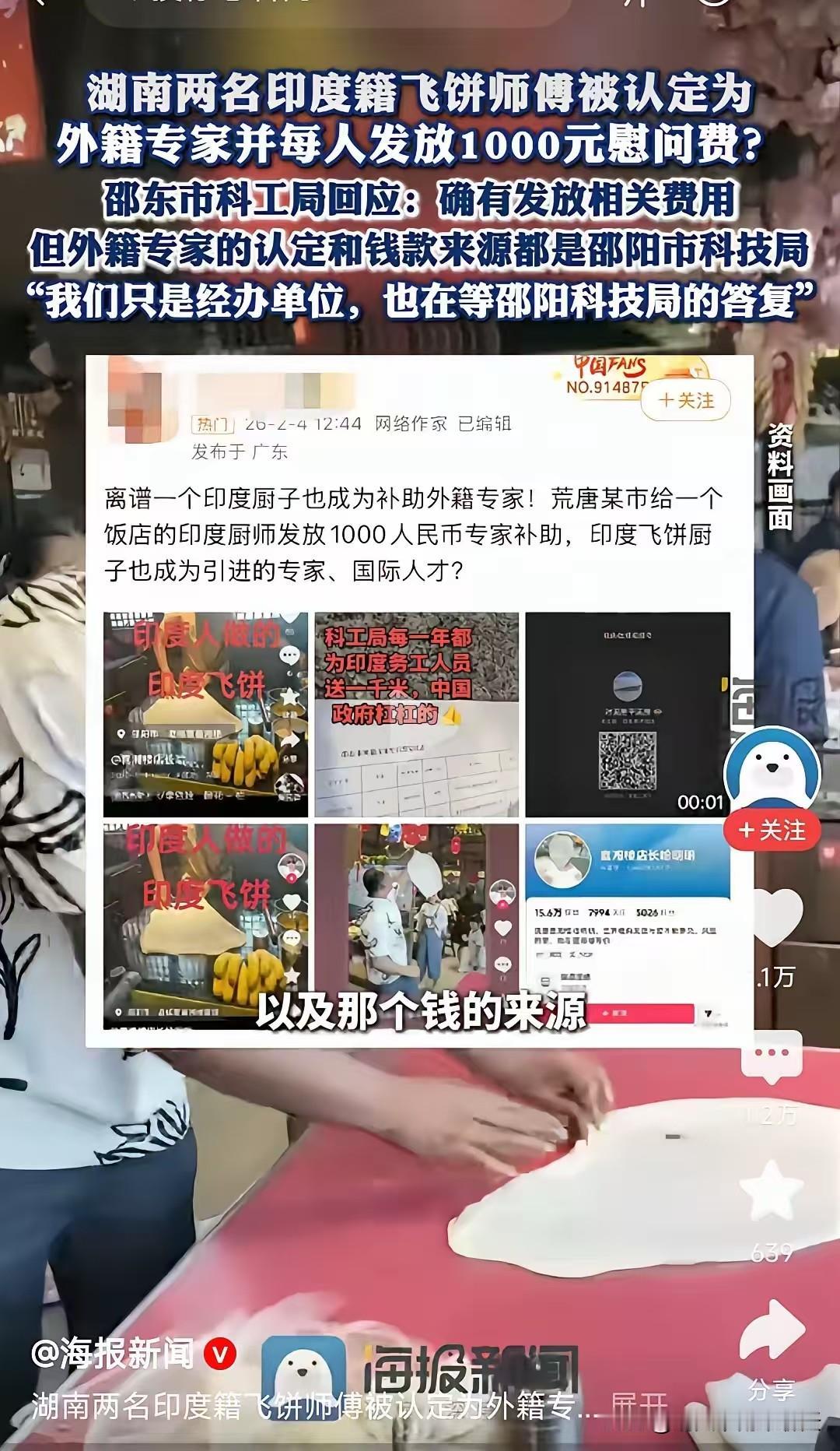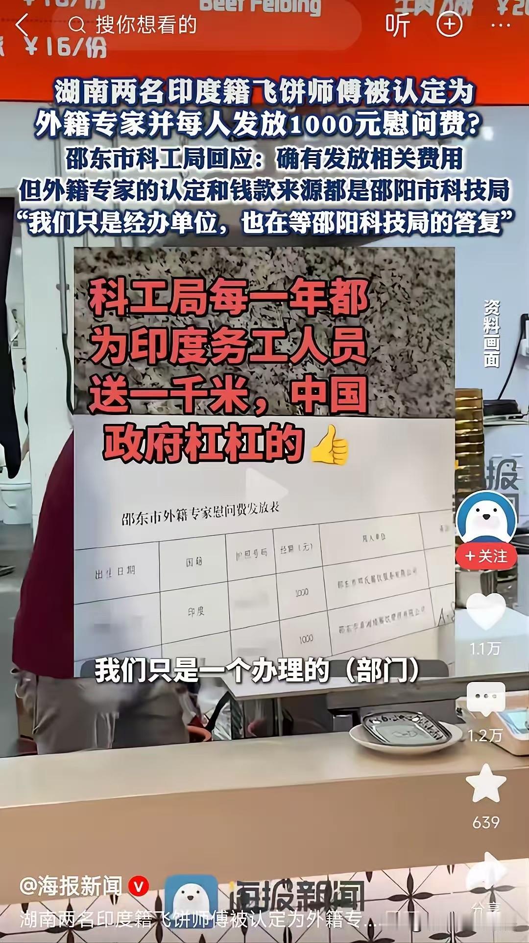 这飞饼科技含量很高吗? 就与煎饼差不多吧,也叫手抓饼、千层饼,擀平→刷油→切开卷起→再擀平,可以想做几层做几层,还可以加鸡蛋、生菜、火腿,口感酥脆鲜香,比印度飞饼好吃得多,只不过没有花里胡哨的炫酷动作罢了。 要说面饼的种类,咱们如排第二,全世界没有敢说第一的,所以,做饼的专家就太多了,只是绝大多数没有慰问金。 对于外藉专家,这1000元慰问金也太少了,这格局还是没有完全打开。