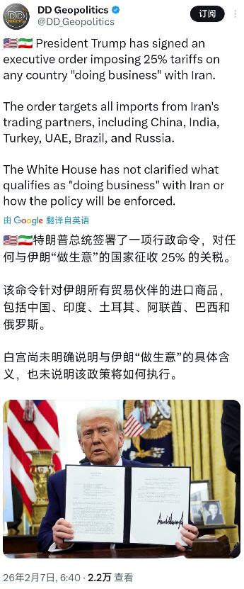 美国总统特朗普今天(北京时间2月7日)签署了一项行政命令,对任何与伊朗“做生意”的国家征收25%的关税。该命令针对伊朗所有贸易伙伴的进口商品,包括中国、印度、土耳其、阿联酋、巴西和俄罗斯。白宫尚未明确说明与伊朗“做生意”的具体含义,也未说明该政策将如何执行。 特朗普显然是不想按常理出牌了,以前制裁都是针对具体企业或者个人,这次直接上升到国家层面,而且是针对所有贸易伙伴的进口商品都要加税,这种“连坐”的法子,在国际贸易史上都少见,摆明了是想切断伊朗的所有外部经济血管,哪怕这会得罪全世界,他也毫不在意。 那些被点名的国家现在心里估计都在打鼓,特别是像印度、土耳其这些跟伊朗能源联系比较紧的,平时没少买伊朗的油或者跟那边有基建合作,这下好了,一边是实实在在的便宜资源,一边是美国那沉甸甸的25%关税,这选择题做得让人头大,选哪边都得掉层皮。 中国作为全球最大的贸易国之一,跟伊朗的经贸往来自然不少,这突如其来的关税大棒,直接就是要砸在中美贸易本来就紧张的神经上,本来大家还在谈这谈那,现在特朗普直接来这么一下,等于把谈判桌掀了一半,就是要逼着别人在伊朗和美国之间做切割,这种霸道做法,完全就是把别国的主权利益当成了筹码。 更耐人寻味的是,连俄罗斯也被列了进去,美俄关系现在僵成那样,俄罗斯本来就被制裁得够呛,再多这25%的关税也就是锦上添花而已,但这说明特朗普这次是铁了心要搞个“全面封锁网”,不管你是盟友还是对手,只要沾了伊朗的边,一概不放过,这种“无差别攻击”的打法,只会让国际局势变得更加混乱。 商业逻辑最讲究确定性,可白宫这政策到现在连个具体执行细则都没有,什么叫“做生意”?是买一桶油算,还是买几吨地毯算?亦或是金融机构有点资金往来就算?这种没标准的规定,让那些跨国公司根本没法做业务规划,谁也不敢保证自己下个月会不会突然就被扣上了“违规”的帽子。 阿联酋和巴西这些国家估计也在挠头,他们跟伊朗地理上近,或者本来就有传统的区域贸易往来,现在美国人隔着太平洋指手画脚,非要他们断绝关系,这强权政治的味道太冲了,根本就不顾别人的实际情况和发展需求,完全是“顺我者昌,逆我者亡”的霸权思维。 这行政命令一出,全球能源市场跟贸易市场肯定要跟着抖三抖,本来全球经济就复苏得艰难,这么一搞,供应链又要重新洗牌,物流成本、保险费用全得涨,最后这些成本还是会转嫁到普通消费者身上,美国人自己买东西也得贵,这完全是杀敌一千自损八百的招数。 特朗普这招也是意在威慑,他是想告诉全世界,美国的长臂管辖权依然有效,谁也别想在他眼皮子底下搞小动作,他这是在用最大的力气,去维护那个摇摇欲坠的美国霸权体系,生怕别人看出来他外强中干。 这事儿最麻烦的地方在于它的不可预测性,既然连俄罗斯这种强硬角色都不放过,那其他国家更别想侥幸过关,只要美国海关或者财政部觉得你有问题,那你的货到了港口就得被扣,关税就得加,这种人为设置的贸易壁垒,比单纯的市场竞争要恶心一百倍。 各国现在肯定都在紧急磋商,看看怎么应对这种无理要求,是硬刚到底承受关税,还是忍气吞声断绝跟伊朗的往来,这中间的权衡利济,非常考验外交智慧,特别是对于那些在大国之间走钢丝的国家来说,这一脚踩空了就是万丈深渊。 伊朗那边虽然没怎么吭声,但这招“闭关锁国”的打法,肯定是想把伊朗困死在孤岛上,不让它有一丝喘息的机会,这种手段虽然狠辣,但往往也会激起更强的反弹,历史上这种全面封锁很少能让一个国家彻底屈服,反而会逼着他们自力更生或者寻找地下贸易渠道。 咱们现在也是骑虎难下,一边是原则问题,不能被美国随便吓唬住,要是这次怂了,指不定下次他又拿什么事儿当借口要价,另一边是实实在在的经济利益,25%的关税对于出口企业来说就是生死线,这中间的平衡点,极其难找。 这行政命令就像一颗不定时炸弹,虽然现在还没完全炸开,但引信已经点着了,未来几个月,全球贸易格局肯定要因为这事儿剧烈震荡,谁也躲不过去,大家都在屏住呼吸,看这出大戏最后到底怎么收场,是特朗普真能一手遮天,还是这把火烧到了他自己身上。