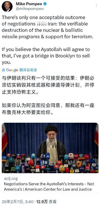美国前国务卿蓬佩奥今天(北京时间2月7日)发文写道:“与伊朗谈判只有一个可接受的结果:伊朗必须切实销毁其核武器和弹道导弹计划,并停止支持恐怖主义。如果你认为阿亚图拉会同意,那我还有一座布鲁克林大桥要卖给你。” 【蓬佩奥转发了自己在aclj的文章:《谈判符合阿亚图拉的利益,而非美国的利益》】 蓬佩奥提出的“伊朗必须切实销毁其核武器和弹道导弹计划,并停止支持恐怖主义”这一唯一可接受结果,从现实来看完全超出了伊朗的底线。 国际原子能机构2025年11月的报告显示,伊朗截至2026年2月持有约274.8公斤丰度60%的高浓铀,总浓缩铀库存更是超过8294公斤,这些材料若进一步提纯至90%武器级水平仅需几周时间,但伊朗始终坚称所有核活动限于民用,用于生产70余种放射性药物等和平用途,其和平利用核能的权利在国际社会有明确依据。 对于弹道导弹计划,伊朗高级官员早已明确表态该议题不在谈判桌上,美方试图将非核问题纳入讨论的做法本身就遭到伊方强烈反对,而伊朗当前拥有中东地区规模最大的弹道导弹库,美国估算数量超3000枚,这些导弹对伊朗而言是核心战略防御力量,销毁计划等同于放弃国家安全重要保障,伊朗方面显然不会接受。 “停止支持恐怖主义”的表述同样存在巨大争议,这一概念的定义在国际社会缺乏统一标准,美国认定的相关组织并未得到全球普遍认同,伊朗始终否认所谓“支持恐怖主义”的指控,认为自身地区行动是基于地缘安全考量的合理举措。 蓬佩奥的这番言论并非突发,他在担任国务卿期间就始终将伊朗视为中东和平的最大威胁,推动美国退出2015年伊核协议后,曾向伊朗提出12项远超原协议的严苛要求,包括完全停止铀浓缩活动、开放所有核设施核查等,如今作为美国法律与正义中心国际事务高级法律顾问,其立场延续了一贯的强硬路线,这篇转发的文章正是他基于该身份对美伊谈判的针对性解读。 从时间线来看,2月5日伊朗外交部长阿拉格齐才宣布6日与美国在马斯喀特举行核问题谈判,伊方坚持谈判范围限于核问题,美方却通过鲁比奥等官员和蓬佩奥的发声,反复试图将弹道导弹等非核议题纳入其中。 这种分歧背后是双方长期的互信赤字,自2025年6月以色列和美国对伊朗核设施发动军事袭击后,伊朗于当年7月签署法律暂停与国际原子能机构的合作,撤出部分核查员,关键核设施架设遮蔽屋顶阻挡卫星监控,尽管9月双方签署开罗协定重启部分核查,但截至目前国际原子能机构仍无法全面接触所有受保障核设施,部分高浓铀去向也未能核实。 伊朗的这些举措被美方解读为不透明的佐证,而伊朗则将其视为应对外部军事威胁的必要安全措施,这种认知差异在蓬佩奥的言论中被进一步放大。 蓬佩奥用“还有一座布鲁克林大桥要卖给你”的表述嘲讽阿亚图拉会同意其要求,本质上是对伊朗核心利益的无视。 伊朗的核政策和导弹计划始终服务于其国家安全战略,面对地区安全环境和外部压力,伊朗不可能轻易放弃这些关键保障。国际社会普遍认为,伊核问题的解决需要尊重各方核心关切,通过平等协商寻找平衡点,单方面设置苛刻前提条件只会导致谈判破裂。 蓬佩奥的言论显然忽视了这一基本事实,也无视了欧洲盟友等国际社会希望维持谈判进程的努力,其背后可能存在美国国内政治立场表达的考量,试图影响当前美伊谈判的走向。 当前美伊谈判已取得初步进展,双方进入方案磋商阶段本身就说明存在对话空间。国际原子能机构的核查机制应当得到充分尊重和执行,这是重建互信的重要基础,各方都应避免发表激化矛盾的言论,以务实态度推动谈判深入。 蓬佩奥的强硬表态虽然延续了其个人一贯立场,但并不能代表美国官方的全部态度,更无法改变通过对话解决伊核问题的国际共识。 伊朗坚持和平利用核能的权利应当得到保障,美方则需要正视伊朗的安全关切,放弃不切实际的单方面要求,只有这样才能让谈判真正取得实质性成果,为中东地区的和平与安全提供保障。任何忽视现实、一味施压的做法,最终只会加剧地区紧张局势,损害各方利益。
