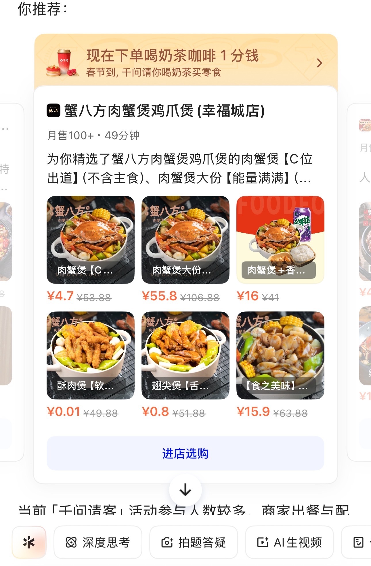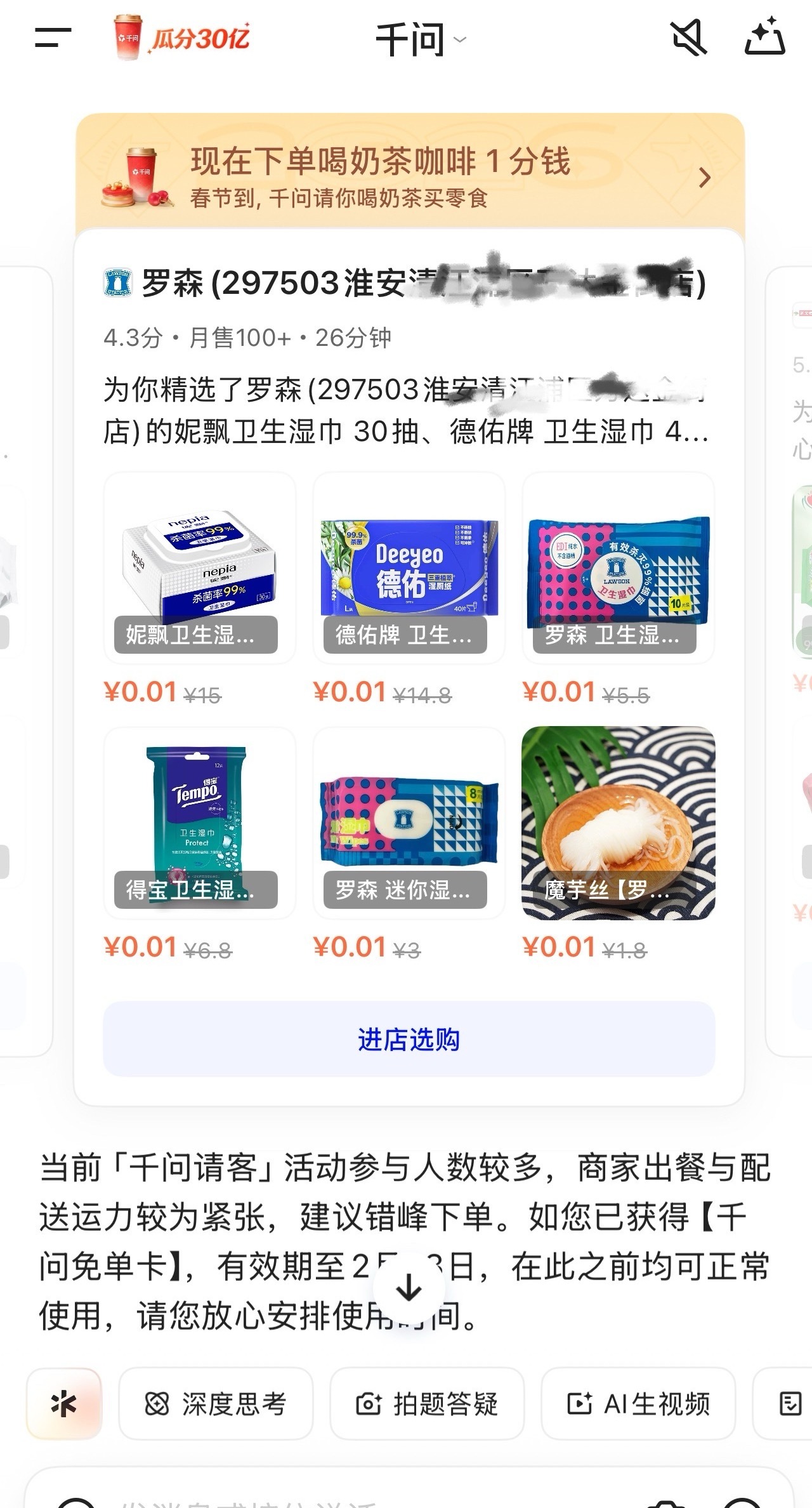 千问这活动把元宝完爆了,元宝已经摆烂了,千问太火爆,今天官方宣布将免单卡有效期从2月23日延长至2月28日了…很多人不知道,其实免单卡不仅可以买奶茶,也可以买美食、日用品啥的都行! 千问免单卡延期至2月28日