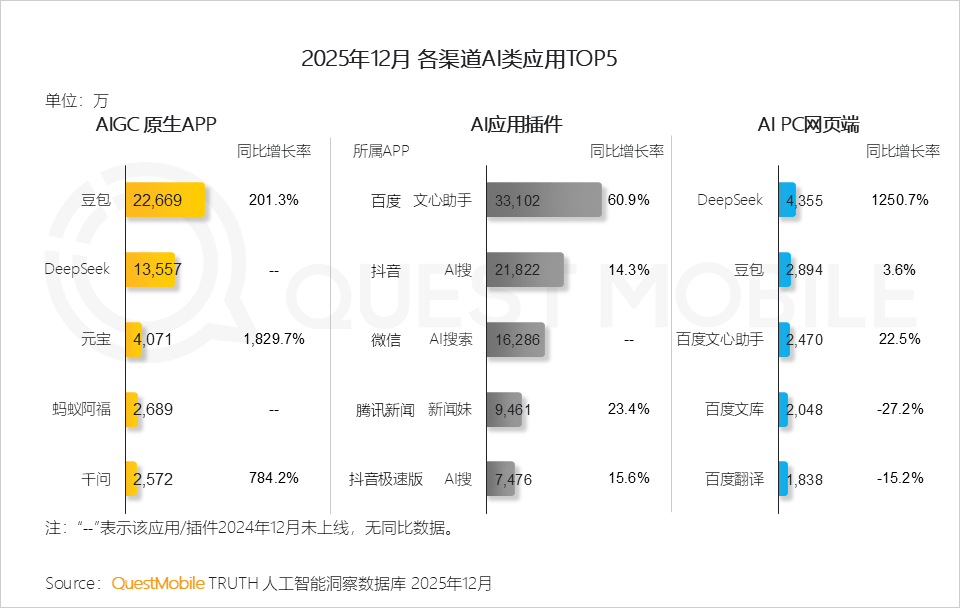 据QuestMobile发布的《全景生态流量年度报告》,2025年12月,在一众AI原生App中,豆包以2.27亿的月活领跑,DeepSeek以1.36亿的月活紧随其后,元宝则以4071万的月活跻身前三,同比激增1829.7%。