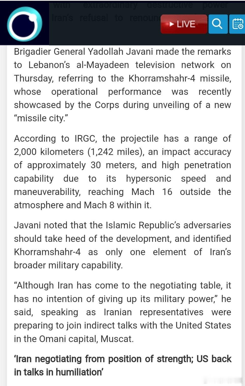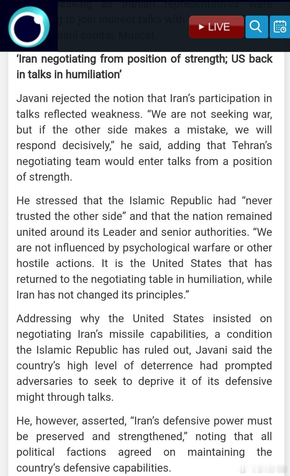 他说:“尽管伊朗已来到谈判桌前,但它无意放弃其军事力量。”当时伊朗代表正准备在阿曼首都马斯喀特参加与美国的间接会谈”。