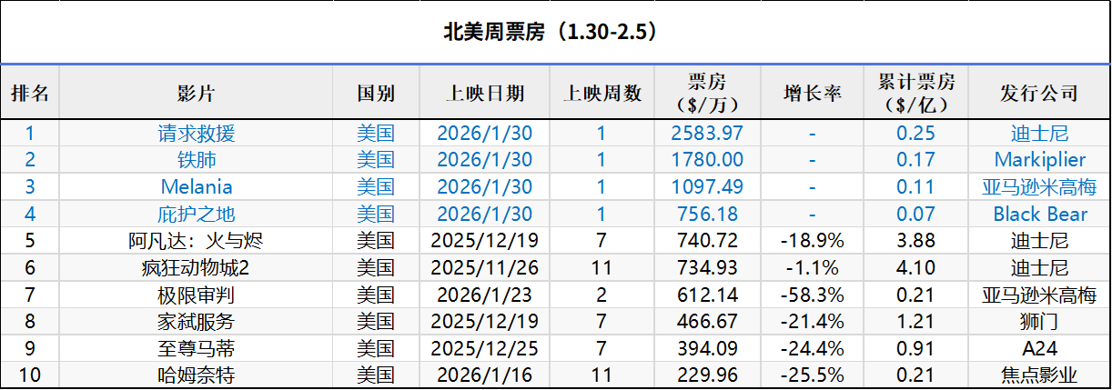 2026年第5周北美票房 :1.《请求救援》开画夺冠,全球票房突破3000万美元;2. 恐怖片《铁肺》开画成绩出色;3.《阿凡达3》全球票房突破14亿美元。(数据:boxofficemojo)