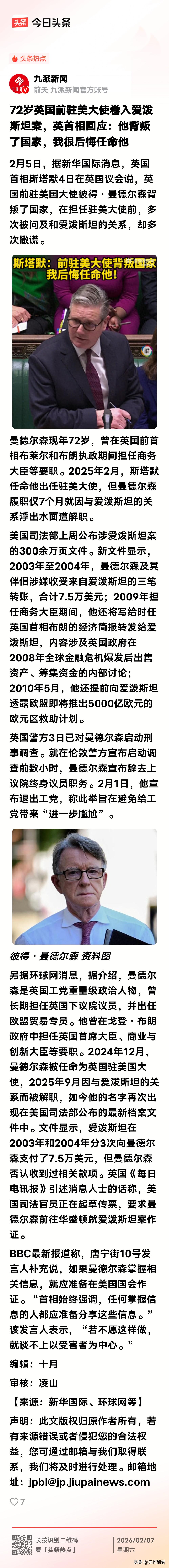 英国首相斯塔默因为任命曼德尔森的这个事,已经陷入了政治风波之中,从目前掌握的情况看,他很可能有被迫辞去首相职务可能。这个曼德尔森也的确太不像话了,不仅卷入了爱泼斯坦案,不雅照片已经流出,而且为了一点蝇头小利,向爱泼斯坦泄露重要情况,不仅没有道德底线,也没有应有的职业操守,斯塔默在明知道他和爱泼斯坦关系密切的情况下,还对他委以重任,这是看人看走眼了,受其连累了!