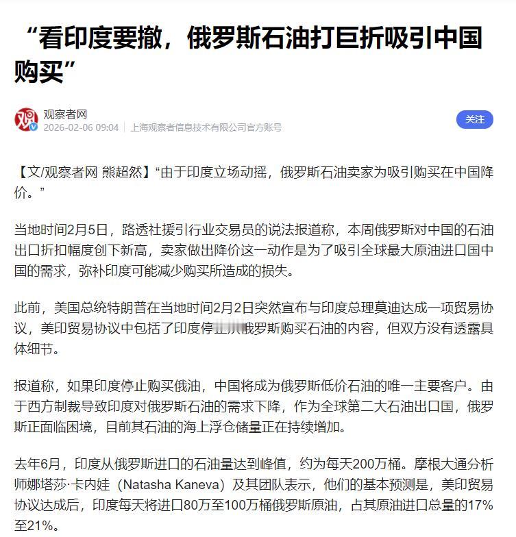 印度不买俄罗斯石油了,俄方急了,专门给中国降价! 当地时间2月5号,有消息说,这周俄罗斯卖给中国的石油,折扣创下了新高。 俄罗斯这么做,目的特别简单,就是想让中国多买点儿,补上印度不买后少赚的钱。 毕竟中国是全世界买石油最多的国家,只要我们多买一点,俄罗斯就少亏一点。 给大家说个具体数,好有概念。以前俄罗斯卖给中国的石油,每桶比国际上的油价便宜7到8美元,这周直接便宜了快9美元,这已经是近几年降得最多的一次了。 另外,之前专门卖给印度的那种石油,现在每桶便宜12美元,以后还可能再降。 有人会问,俄罗斯好好的为啥要降价?其实就是印度不买了。印度以前是俄罗斯石油的大客户,买得特别多,现在印度不买了,俄罗斯的石油就堆在那儿卖不出去,能不急吗? 这事的起因在2月2号,美国总统特朗普突然说,他和印度总理莫迪签了个贸易协议。 协议里说好,印度不再买俄罗斯的石油,作为交换,美国会降低印度出口到美国商品的关税,还取消了之前额外加的关税。不过双方都没说,印度到底从什么时候开始,彻底不买俄罗斯石油。 说实在的,印度之所以答应美国,就是为了多赚钱。印度自己没多少石油,90%都得从国外买,以前买俄罗斯的,就是因为便宜。 这次美国给的好处更实在,降了关税,印度卖东西到美国能多赚不少,算下来划算,就动摇了。 印度以前买得多到啥程度?2025年6月,每天能买200万桶,到今年1月就只剩110万桶了,以后可能会降到每天80到100万桶。 以前印度买的俄油,占自己总进口量的35%,以后可能只剩一半,俄罗斯一下子少了这么个大客户,只能找中国补缺口。 俄罗斯第一个找中国,太正常了。中国是全世界买石油最多的国家,每年都要大量进口,而且我们和俄罗斯一直合作得很好。 今年1月,我们通过海运买的俄罗斯石油,每天就有170万桶,创了历史新高,完全能消化俄罗斯多余的石油。 对我们来说,这也是好事。石油便宜了,国内炼油厂成本就低了,我们老百姓开车加油,也不用担心油价涨得太厉害,算是间接受益。 大家也不用愁,俄罗斯不会一直降价,等以后能源局势稳了,或者找到其他买家,折扣就会缩小。 我们也不会无限制多买,国内炼油厂消化能力有限,预计3月份买的量就会少一点。另外,印度也不会彻底不买俄油,毕竟俄罗斯石油便宜,短期内没人能替代。 总的来说,这事就是各方算自己的账:美国想打压俄罗斯,印度想赚更多钱,俄罗斯想少赔钱。 而我们中国,刚好能借着低价买石油,对老百姓来说,加油价格能稳定,就是实实在在的好处。后续有新消息,再用大白话给大家说。