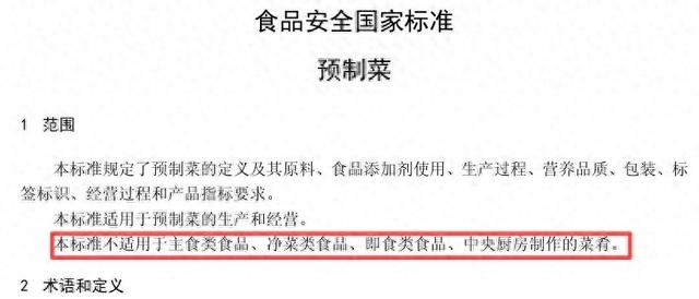 最后是中央厨房制作的菜肴,按照卫健委发布的标准,中央厨房相当于门店自有的厨房,在中央厨房加工制作好,分配到门店的菜肴,都不算预制菜。